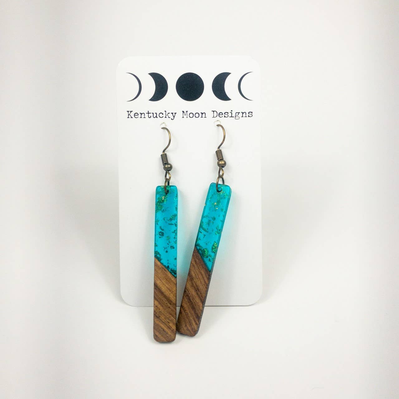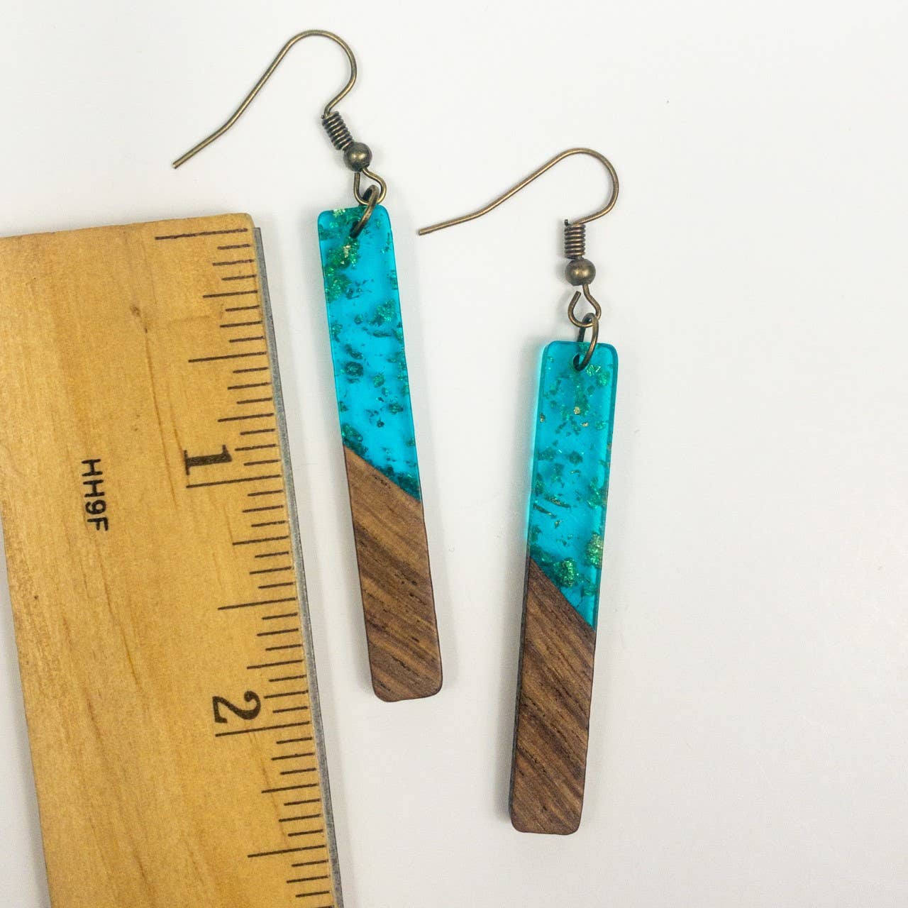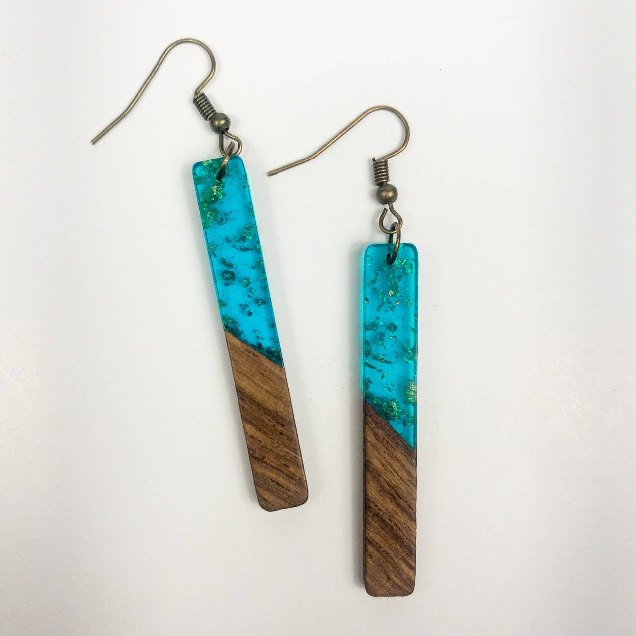 Eye catching wood and resin earrings! A pretty hue of aqua resin with gold flakes. Beautiful wooden ends to bring the natural vibe together! These earrings are perfect for the modern bohemian or those who like minimalist style with a natural feel.