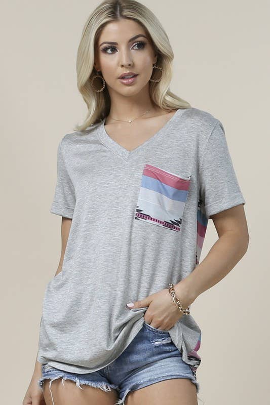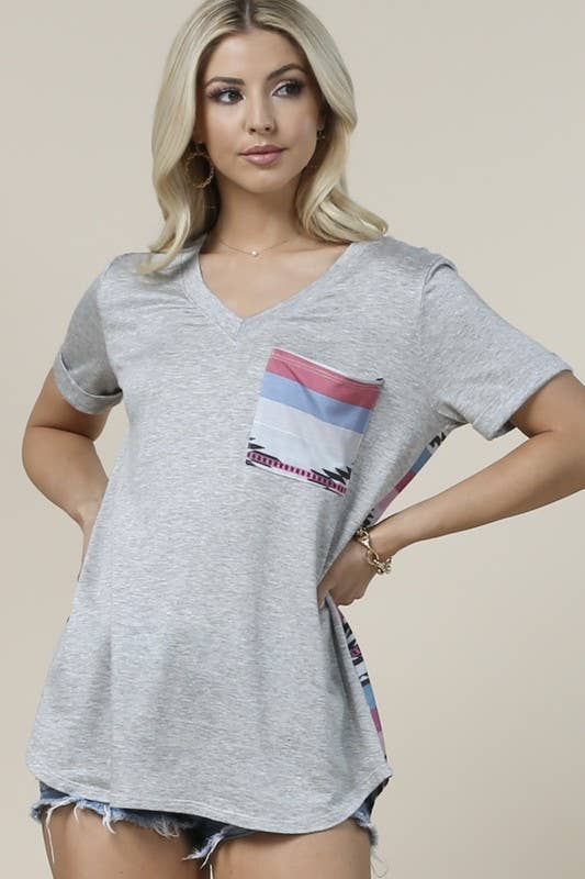 -Aztec Print Color Block Pocket V Neck Short Sleeve Top
