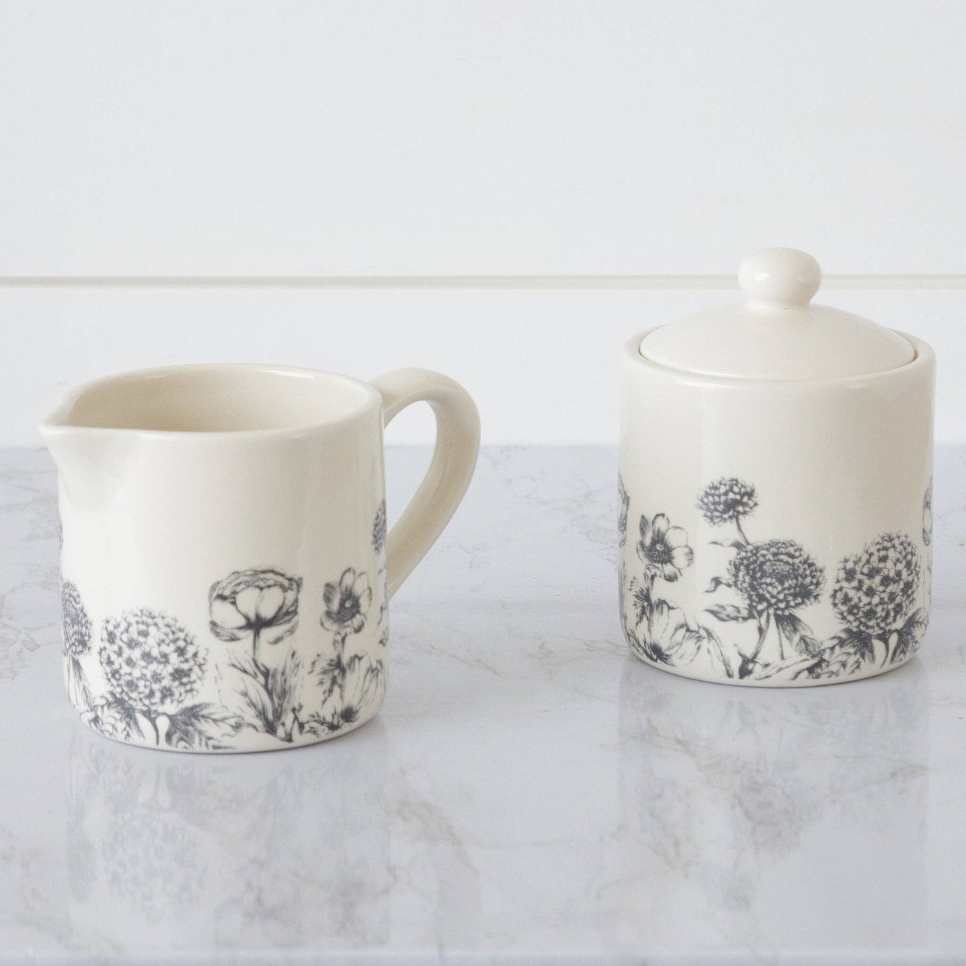 HOME: Black and White Botanical Cream and Sugar (Pair)