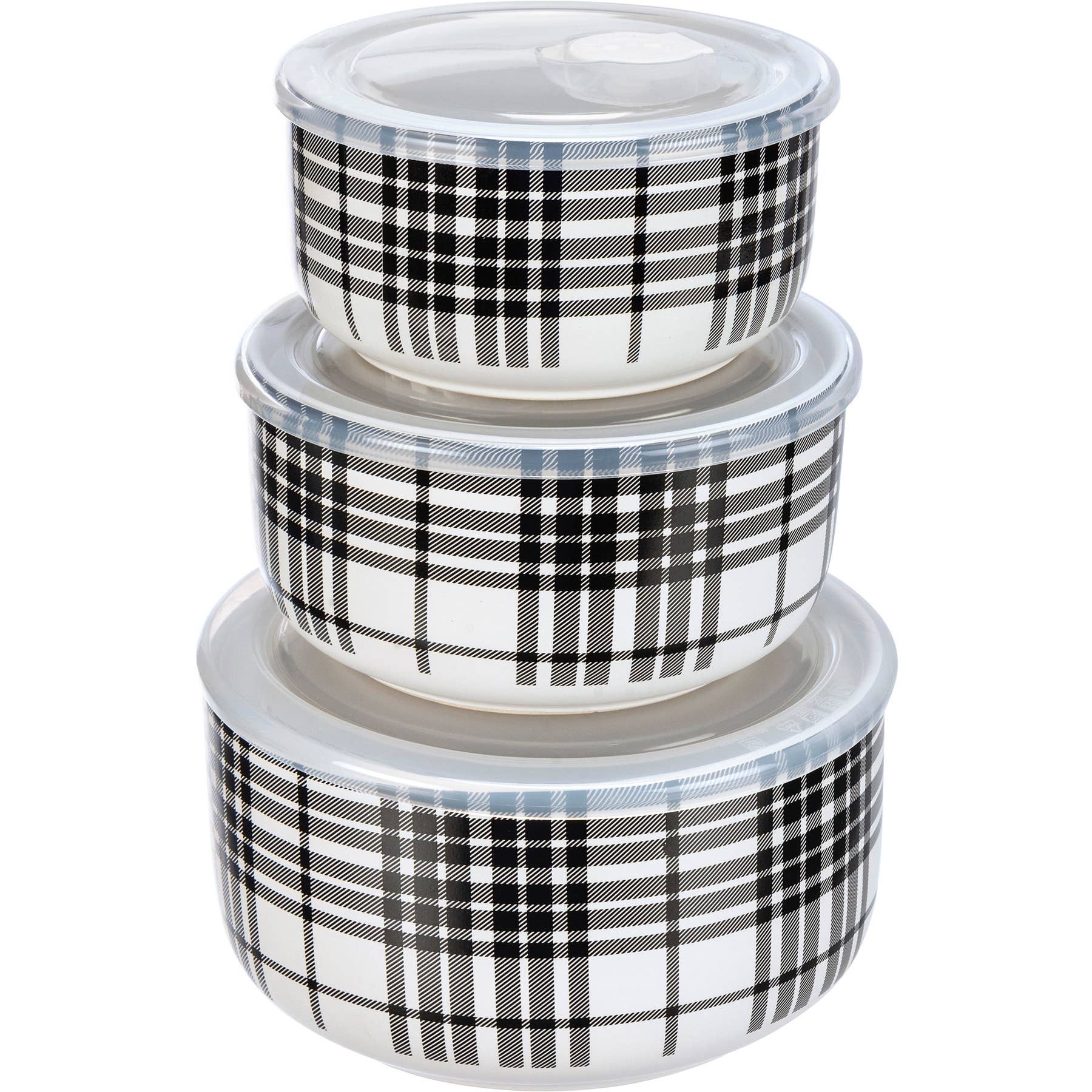 A set of three round stoneware serving dishes. Set includes a small, medium, and large dish featuring an all-over black plaid design. Each dish comes with a plastic lid with a rubber seal. Lid features a date dial to take the guesswork out of keeping track of leftovers. To use, simply set the dial to the number that corresponds to the day of the month when the food is placed in the refrigerator. Microwave, oven, dishwasher, and food safe.