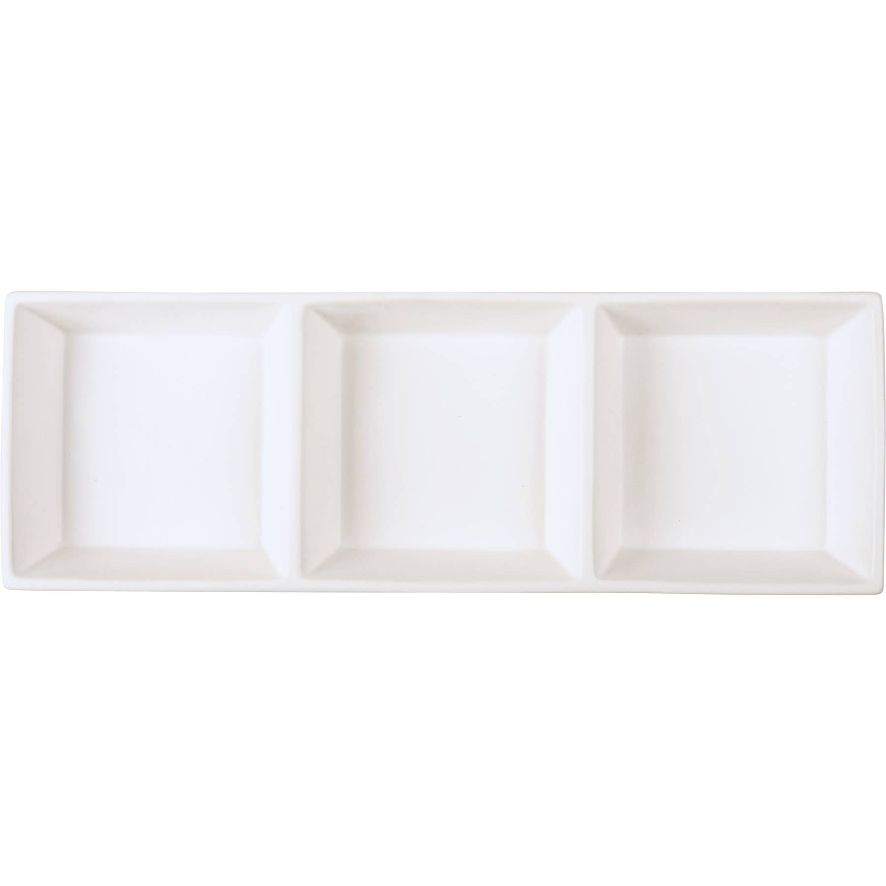 A rectangular stoneware tidbit tray. Features three sections with black plaid designs. Microwave, oven, dishwasher, and food safe.