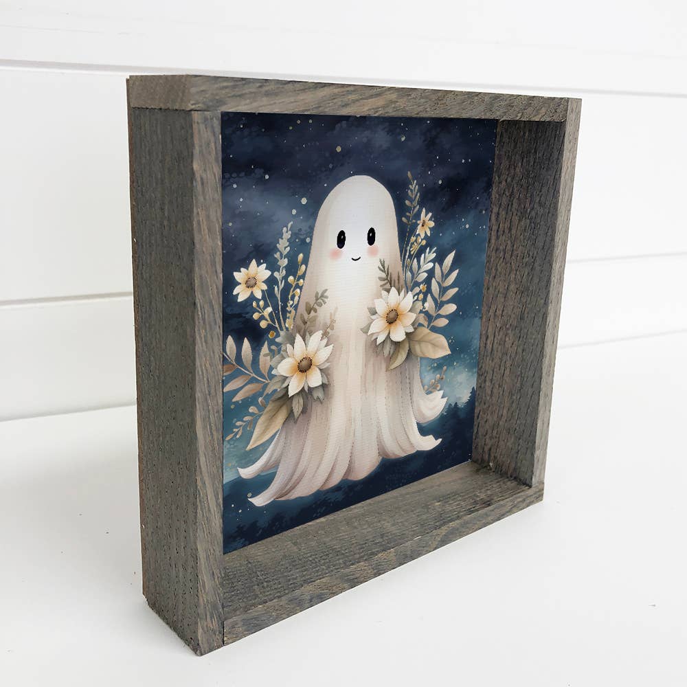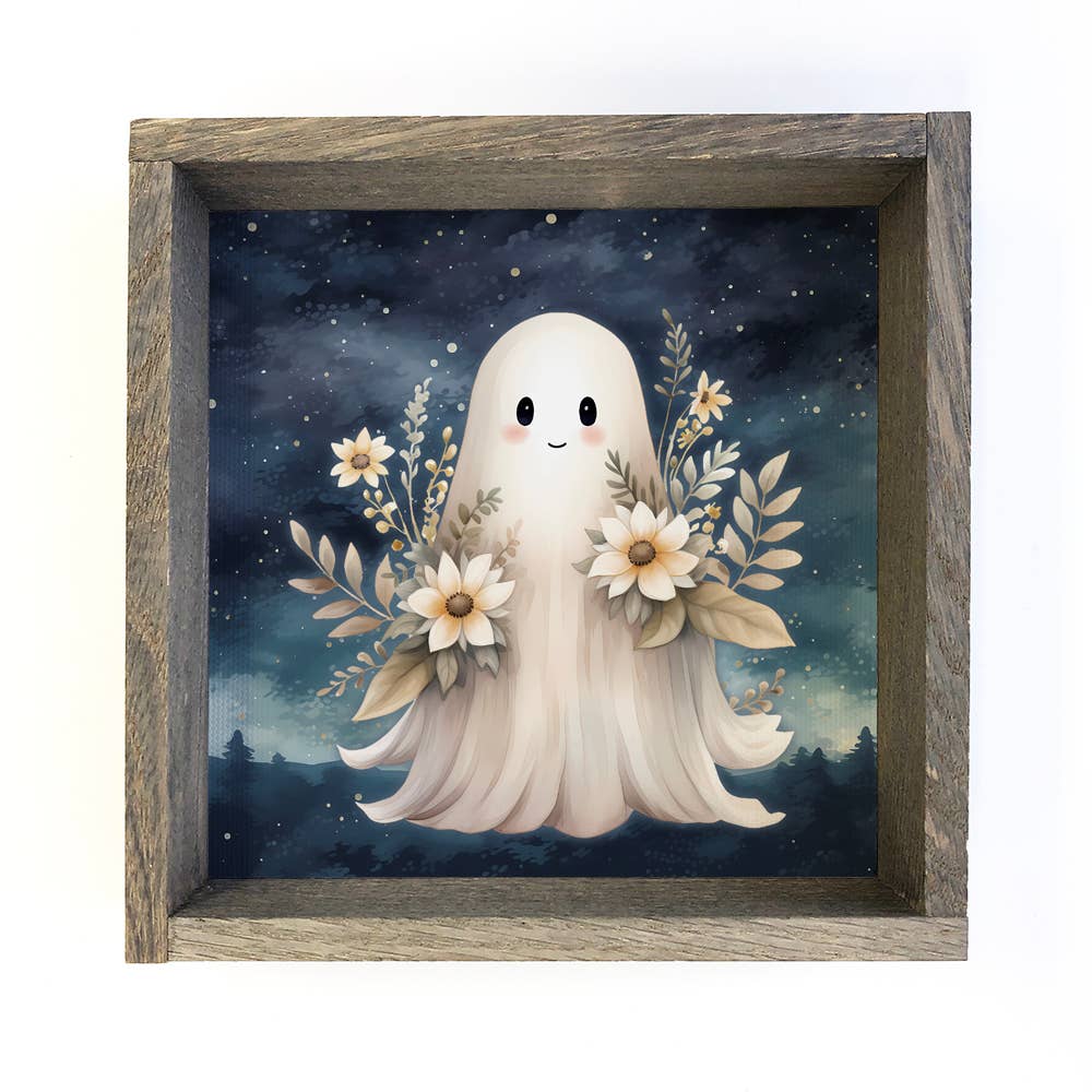 HOME: Fall Cute Ghost With Flowers - Halloween Canvas Art - Framed Art