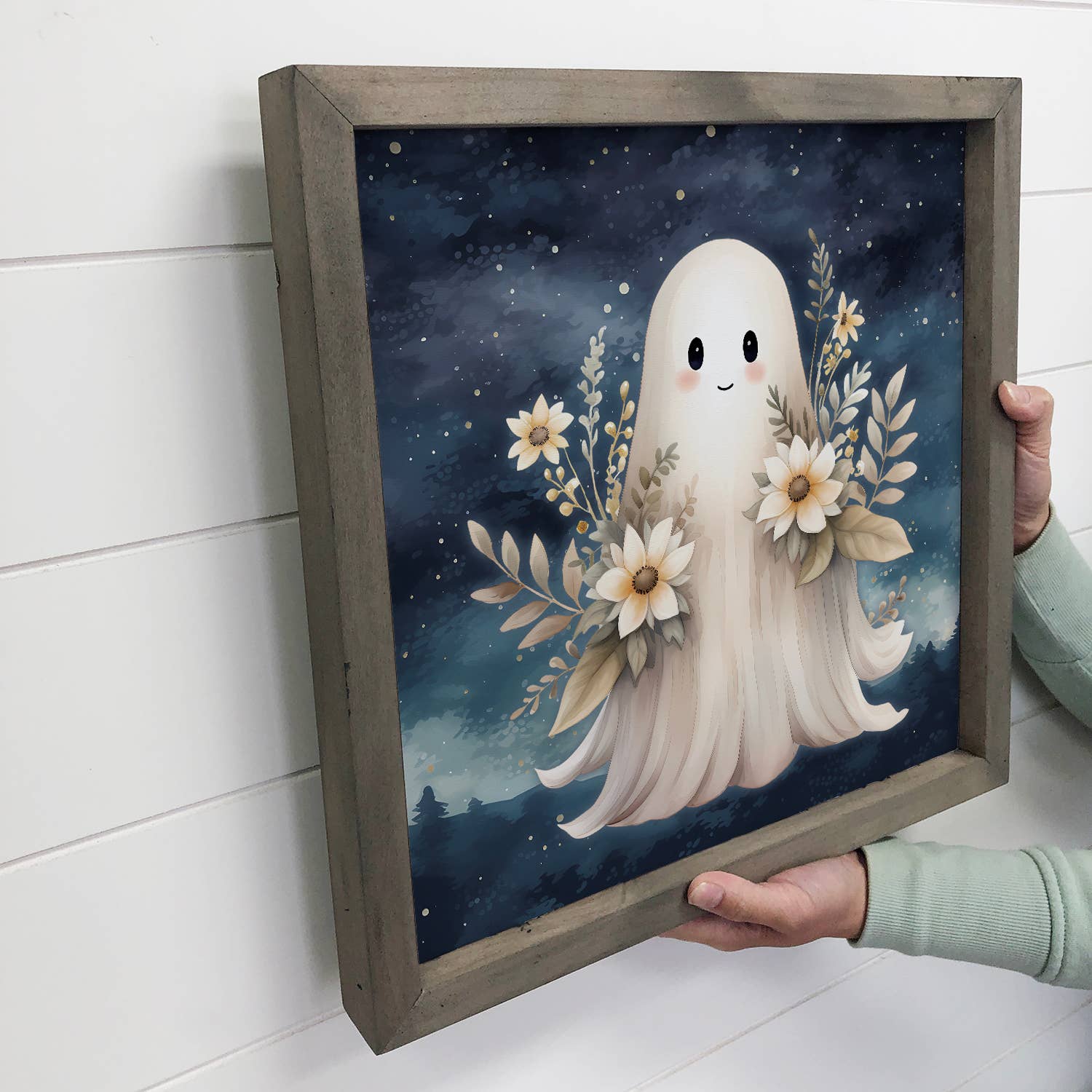 Enchant your home with this art print featuring a darling smiling ghost holding a bouquet of stunning white flowers and light green leafy vines in each hand. Floating gracefully above the silhouettes of pine trees, the ghost adds a touch of playful charm to the serene scene. A night sky scattered with stars completes the magical atmosphere. Perfect for a bedroom.