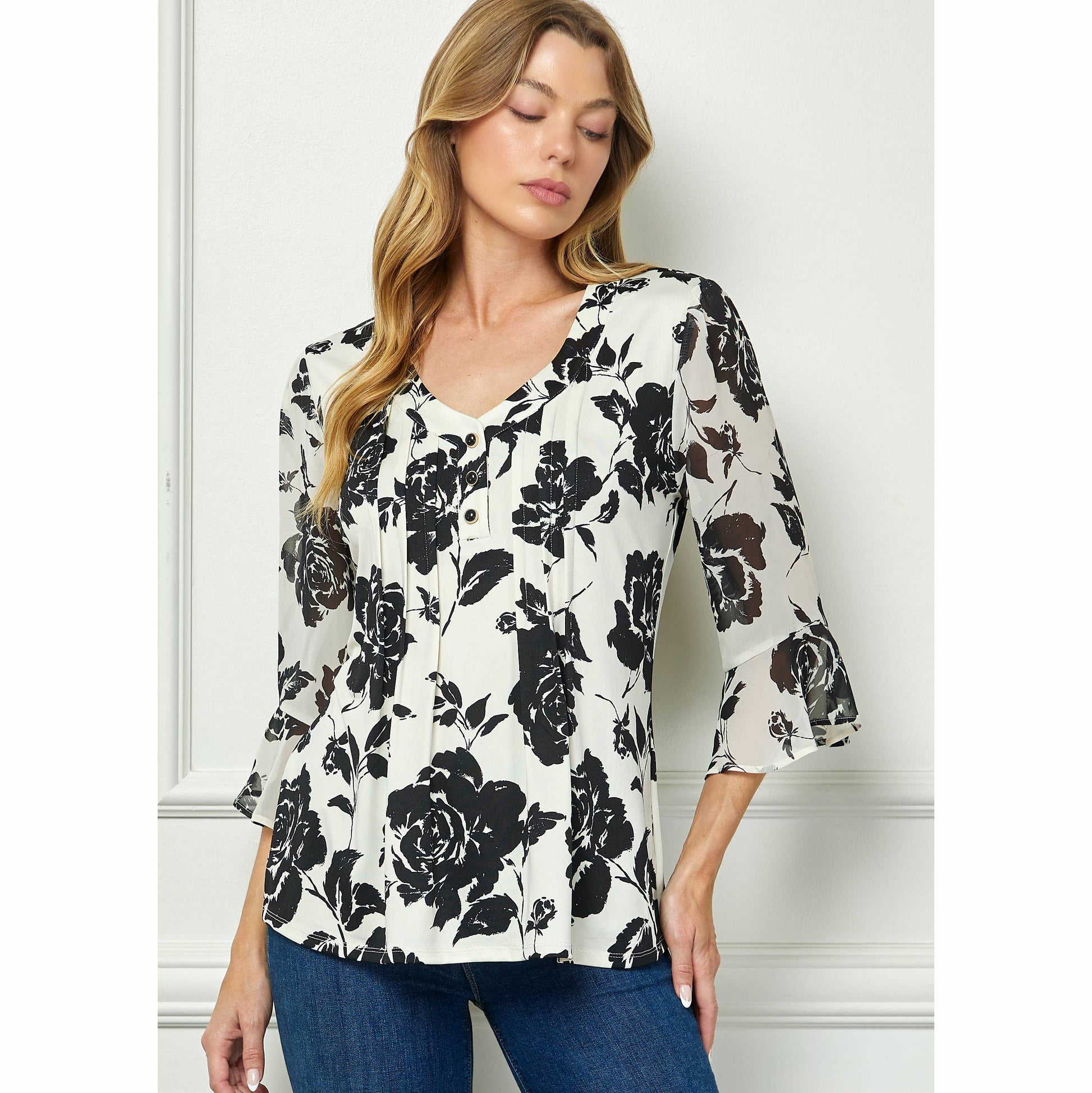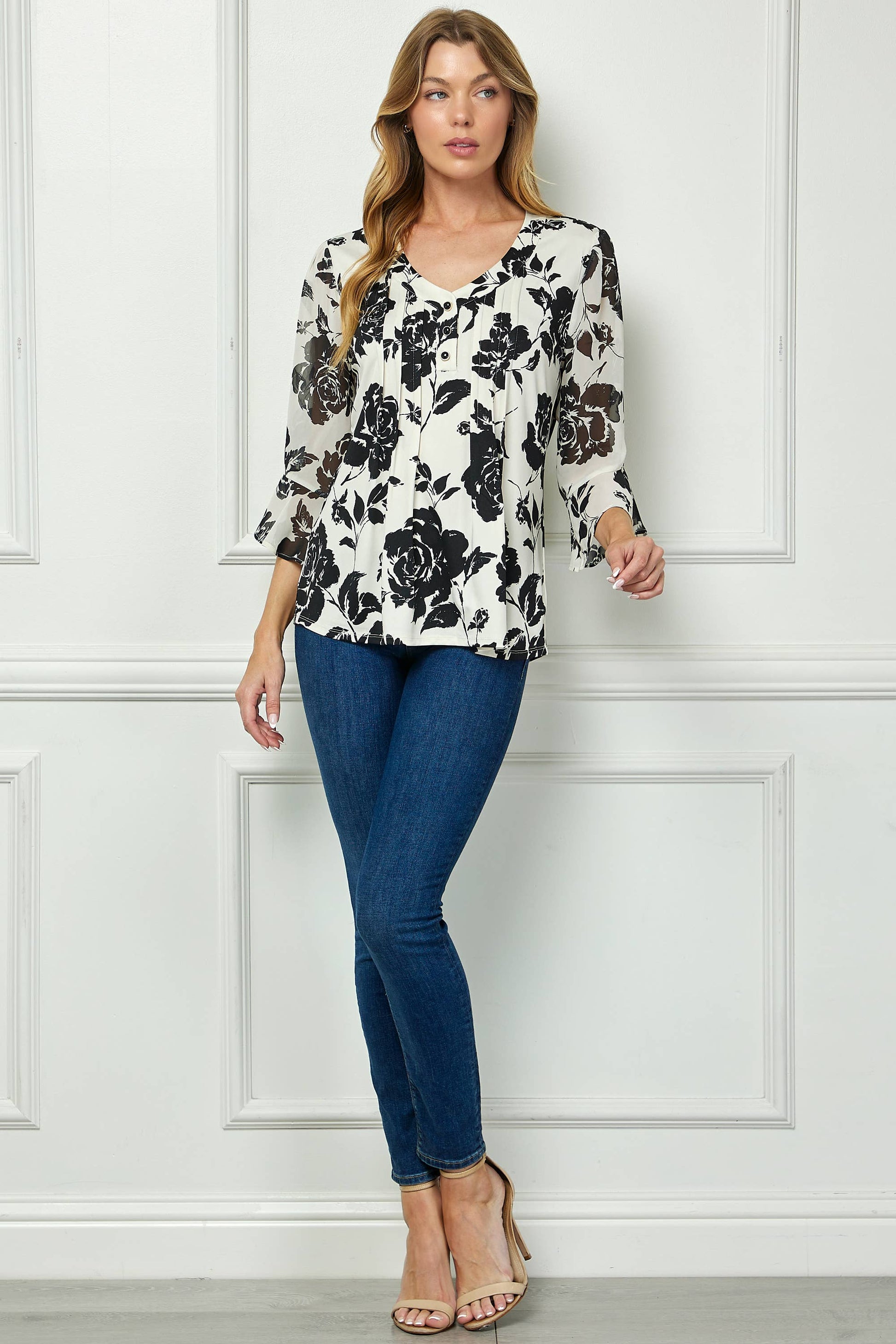 A perfect blend of comfort and elegance, this floral pleated blouse is designed for the modern woman on the go. Featuring soft, flowy chiffon sleeves, a flattering V-neckline with pleat and button details, and a relaxed A-line fit, this top transitions effortlessly from work to weekend.