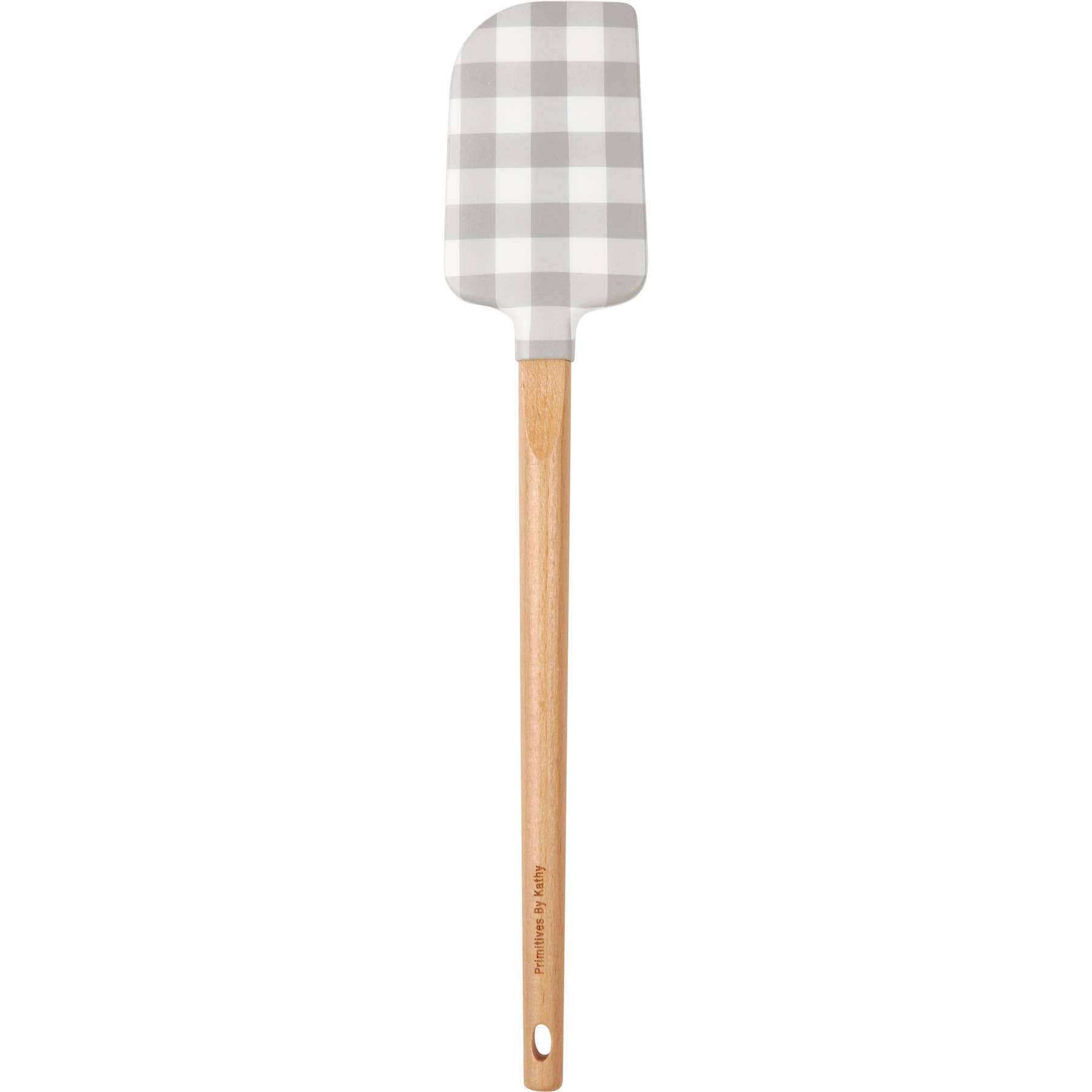 A double-sided silicone spatula from our Farmhouse Collection displaying farm animals stacked in a gray silhouette on one side and gray gingham pattern on the other. Logo is engraved into wooden handle for added interest. Our Farm Animals spatula includes a complementing decorative bow and hole at the bottom for hanging. Hand-wash recommended; not microwave safe. A charming everyday kitchen accessory.