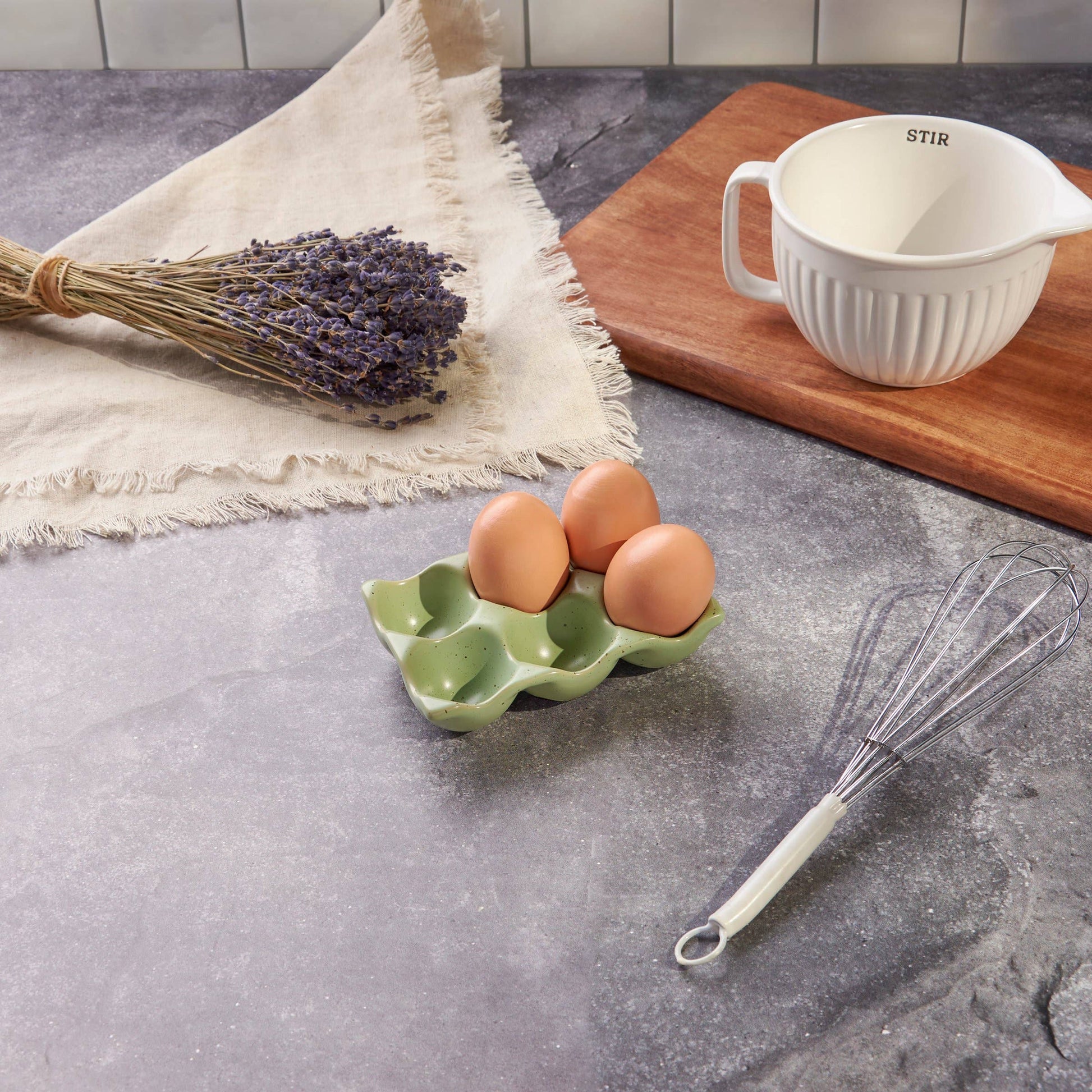 A stoneware egg holder from our Farmhouse Collection displaying a muted green color and speckled accents that coordinates well with farmhouse décor. Egg holder features 6 spaces to hold eggs. Our Farmhouse egg holder is conveniently dishwasher safe for easy cleaning. A rustic kitchen accessory perfect for everyday use.
