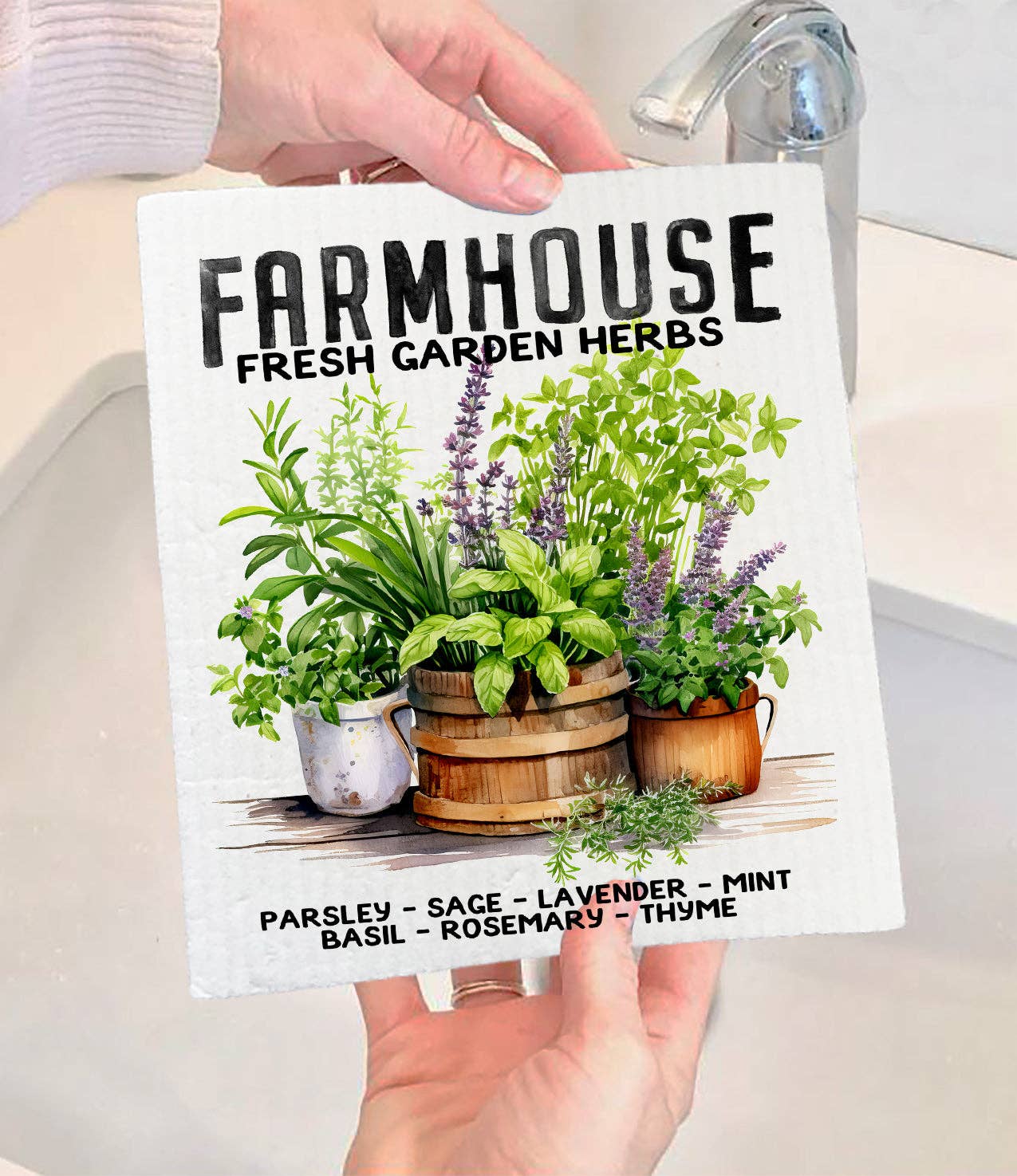 HOME: Swedish Dishcloth Farmhouse Fresh Herbs Basil, Thyme Swedish Dishcloth
