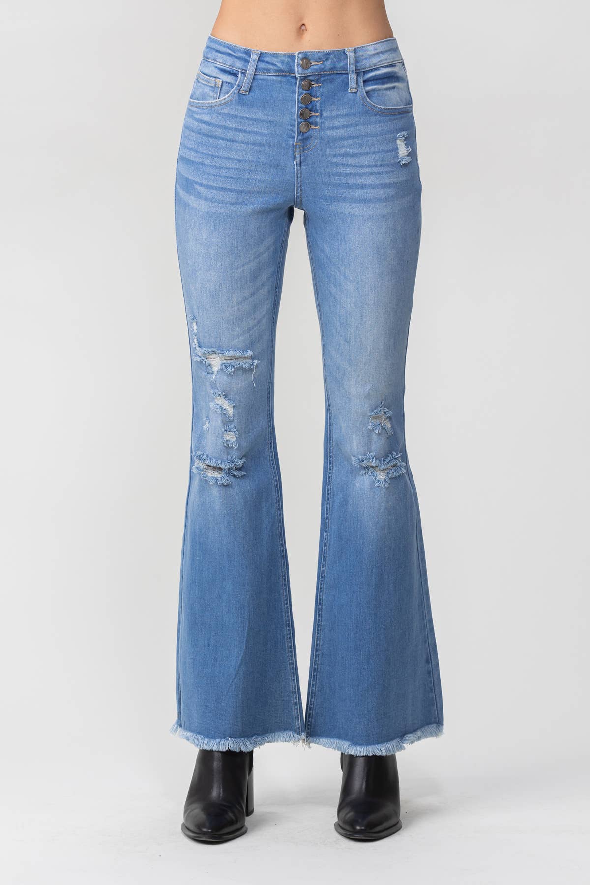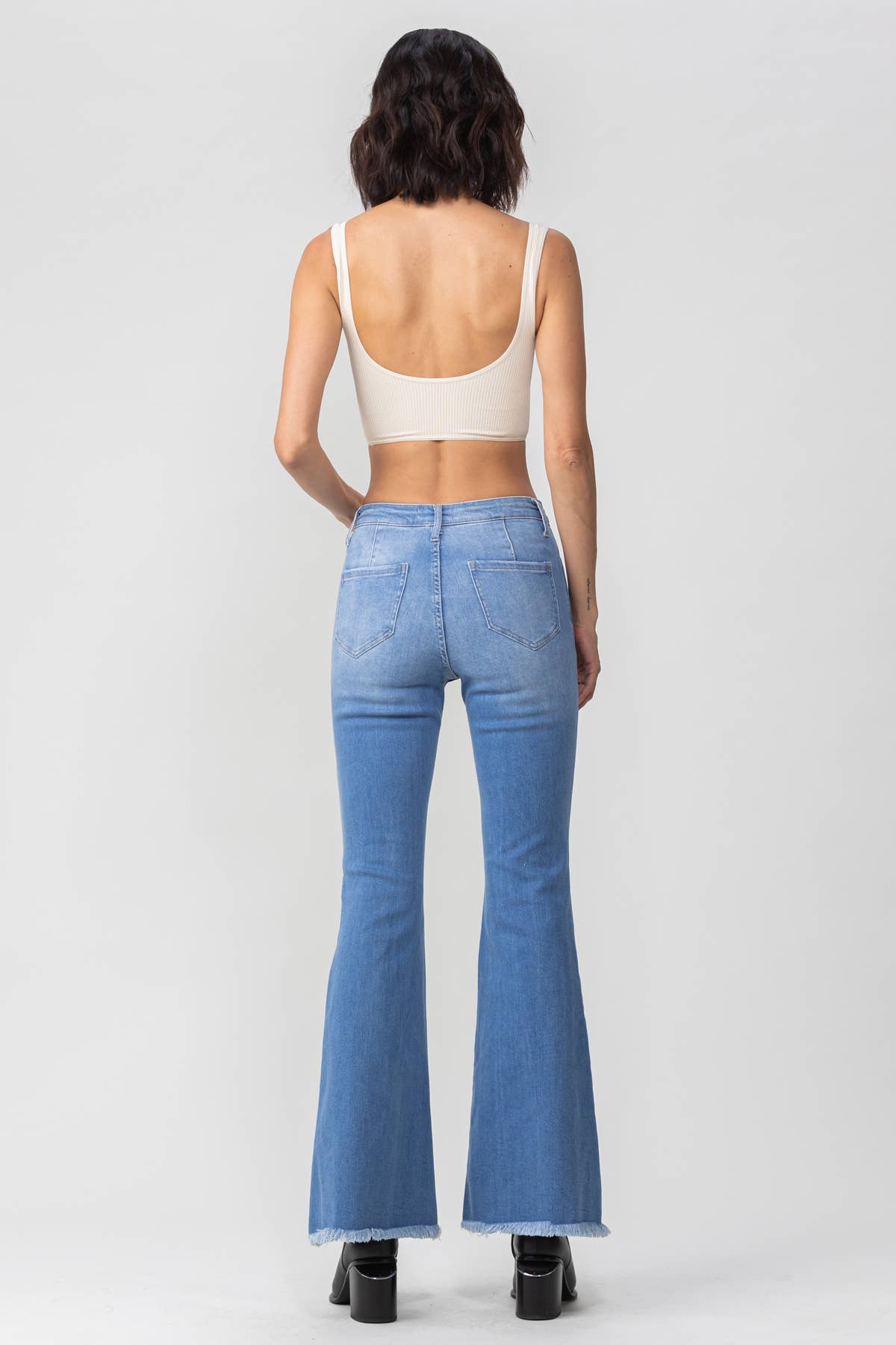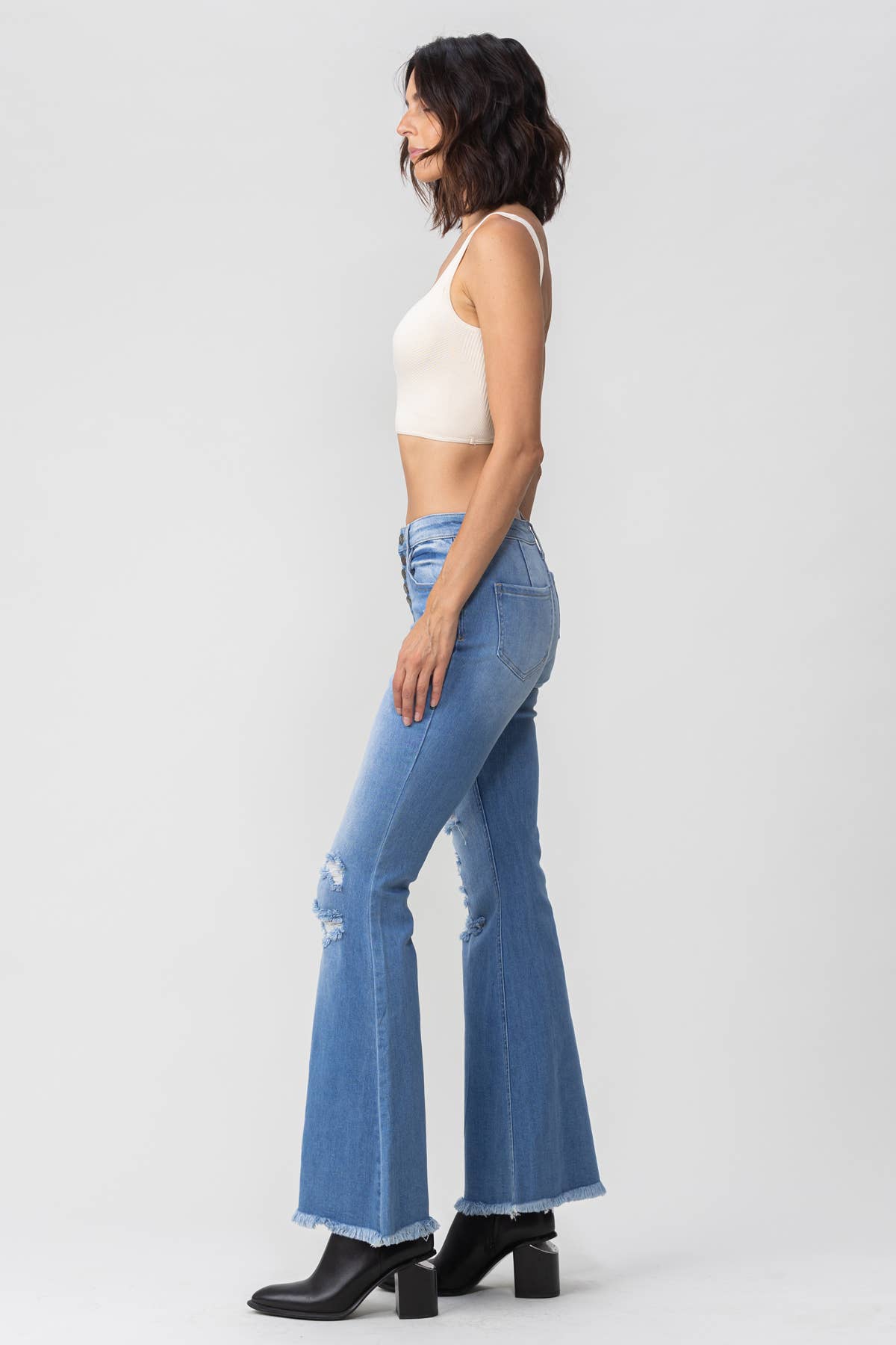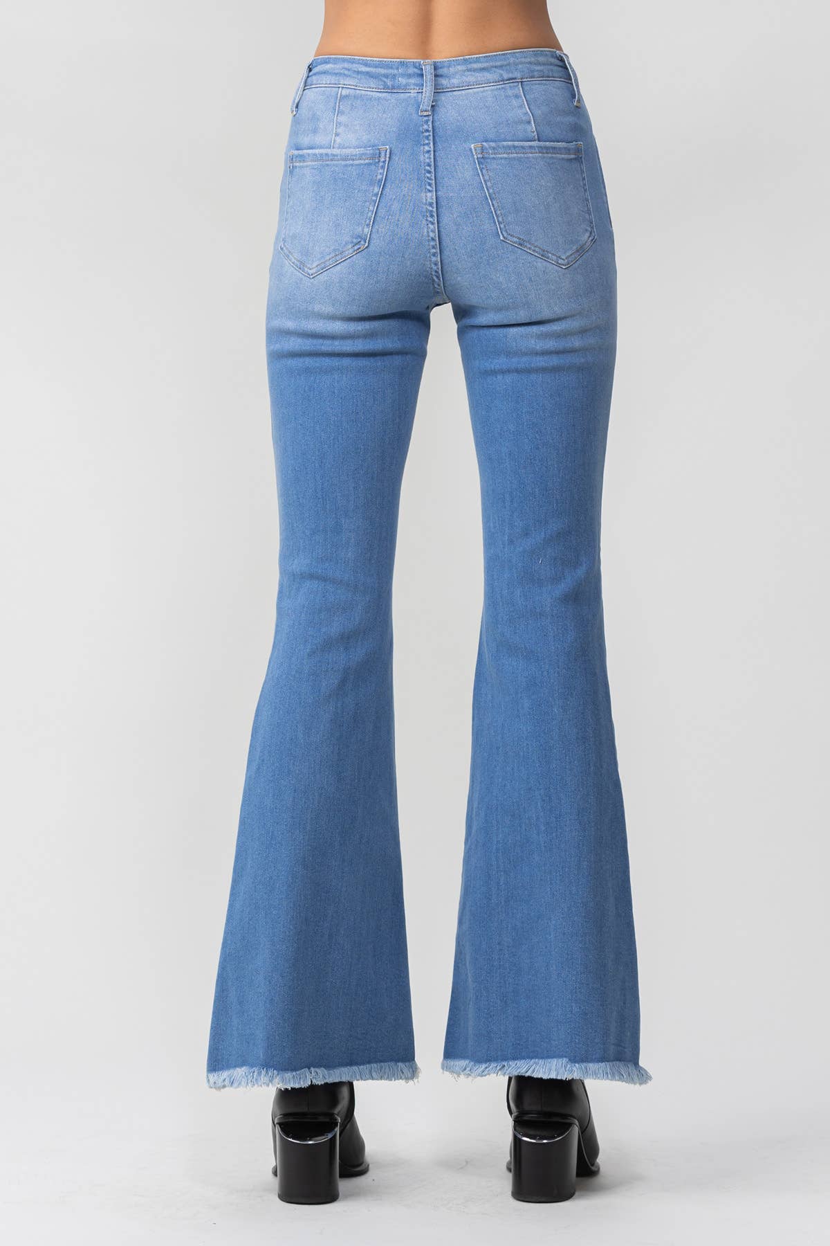 Classic flare jeans with an extra touch! With added distressing and frayed hem, these high rise flares naturally give off a 70's vibe while flattering all body types. With the right amount of stretch and recovery, these jeans have the look and comfort you've been looking for. Exposed Button Fly Five pockets Frayed Hem Stretch Rise - 10 1/2" Inseam - 33"
