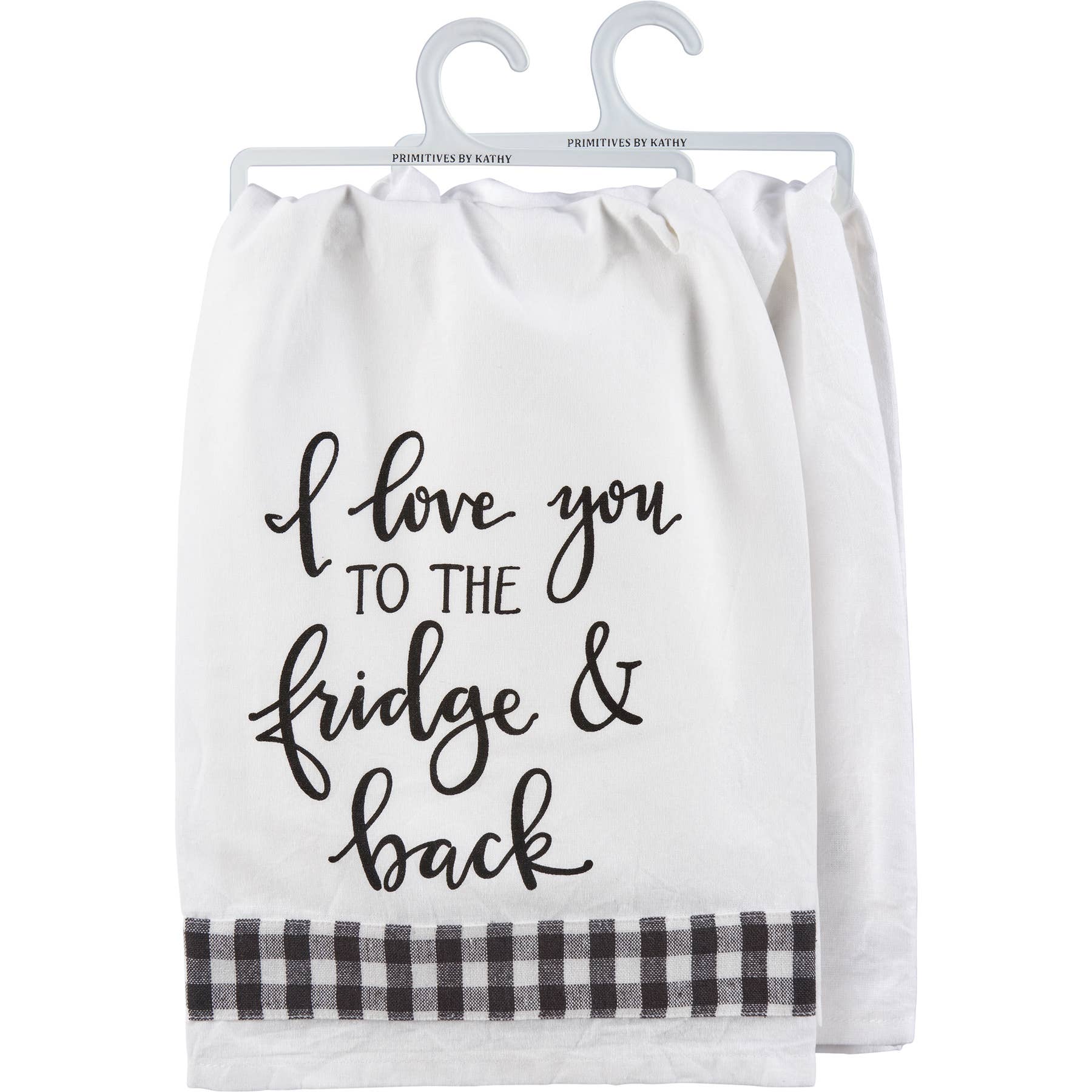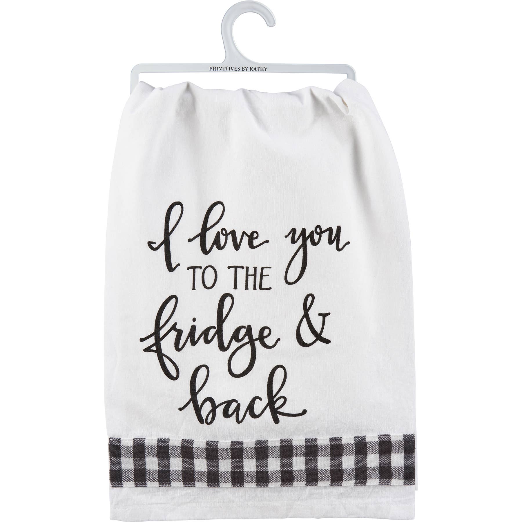 A white cotton kitchen towel from our Room By Room Collection displaying a hand illustrated sentiment that reads "I Love You To The Fridge & Back" with black and white gingham ribbon underneath. Our I Love You To The Fridge kitchen towel is machine-washable for convenient cleaning. Packaged on a clear plastic hanger to easily display on rack. A fun and functional everyday kitchen accent.