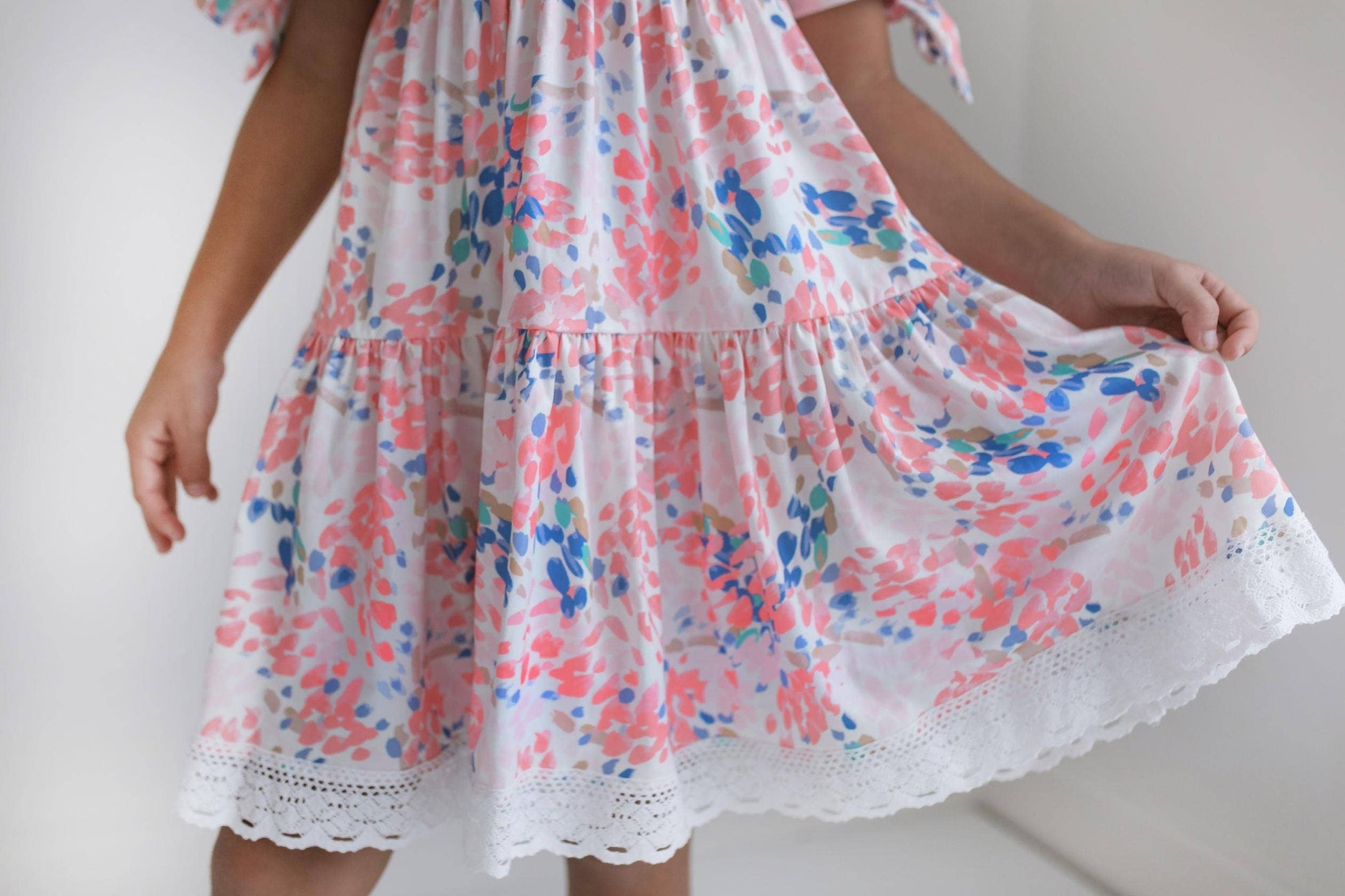 Girls white, pink, and blue tiered square neck dress with lace accents and hem. Short puff sleeves have tie accents. Dress buttons up the back. So cute for spring & summer days! 95% Polyester, 5% Spandex