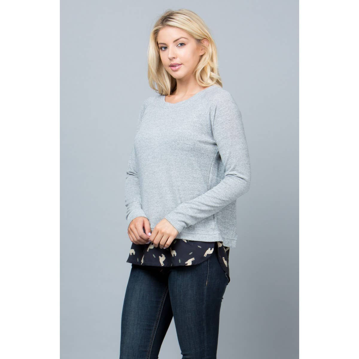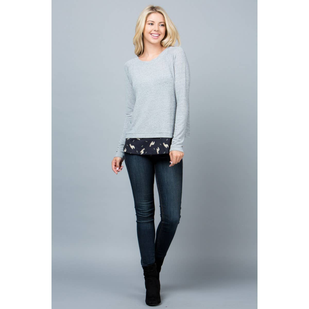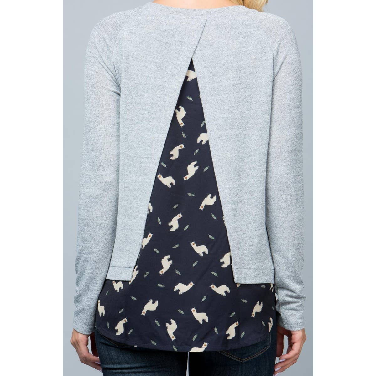 Lhama print sweater top with open vent. Color: grey + black.