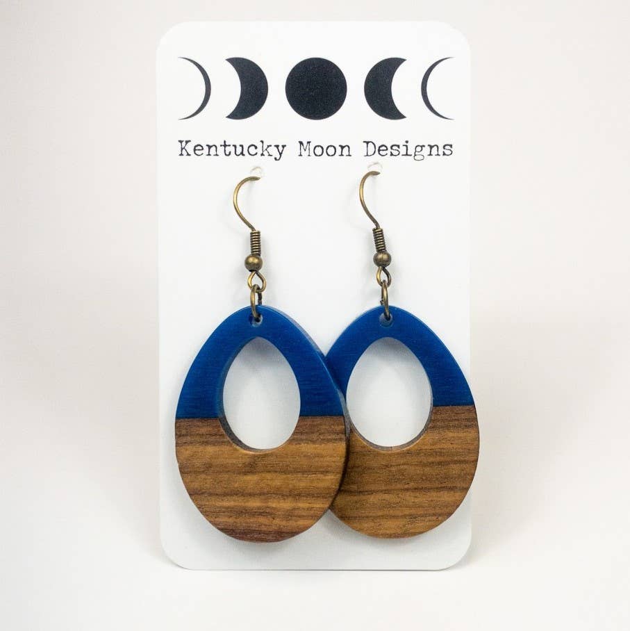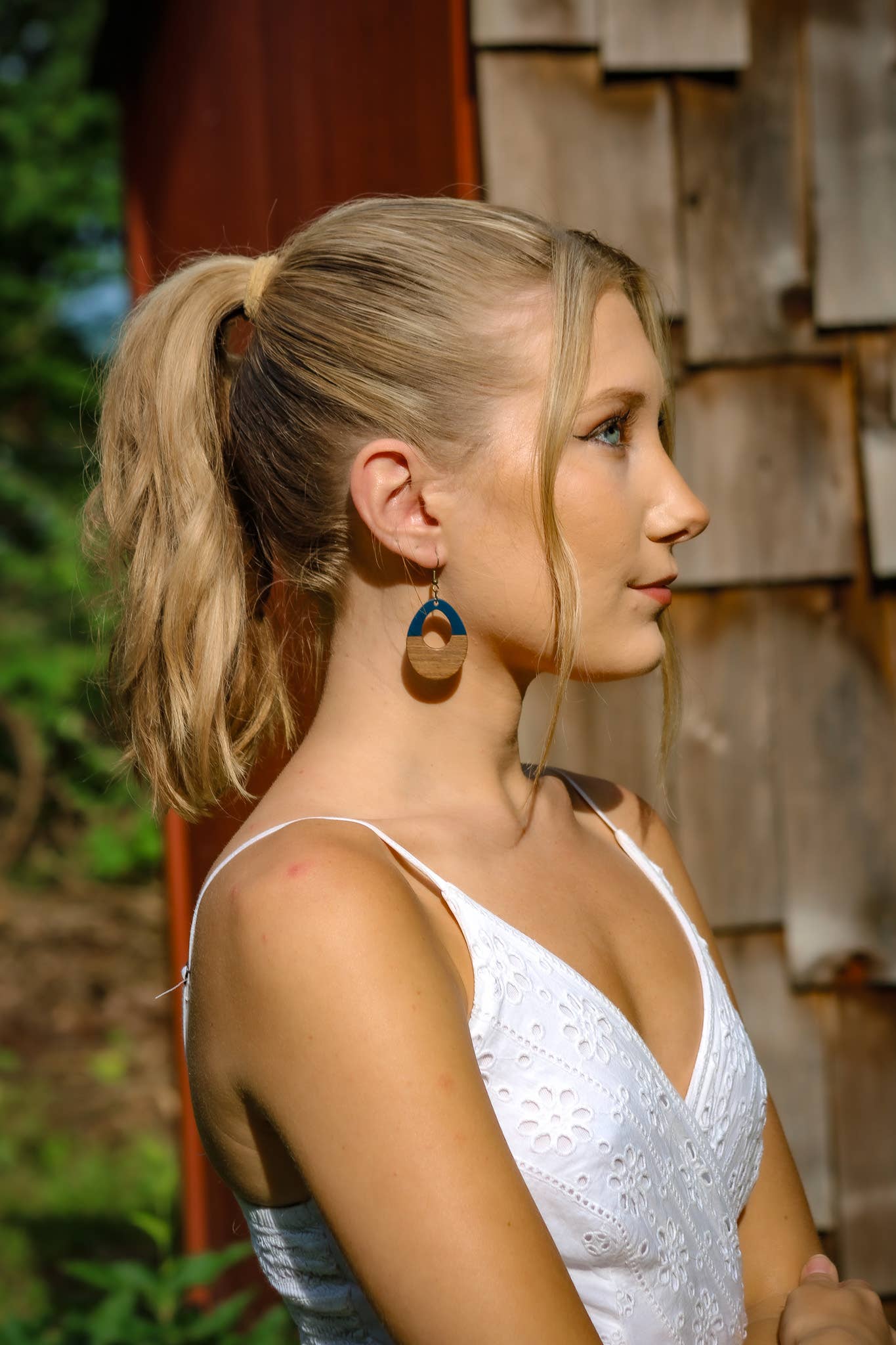 Eye catching wood and resin earrings! Navy Blue resin with wood feature to bring the natural vibe together! These earrings are perfect for the modern bohemian or those who like minimalist style with a natural feel.
