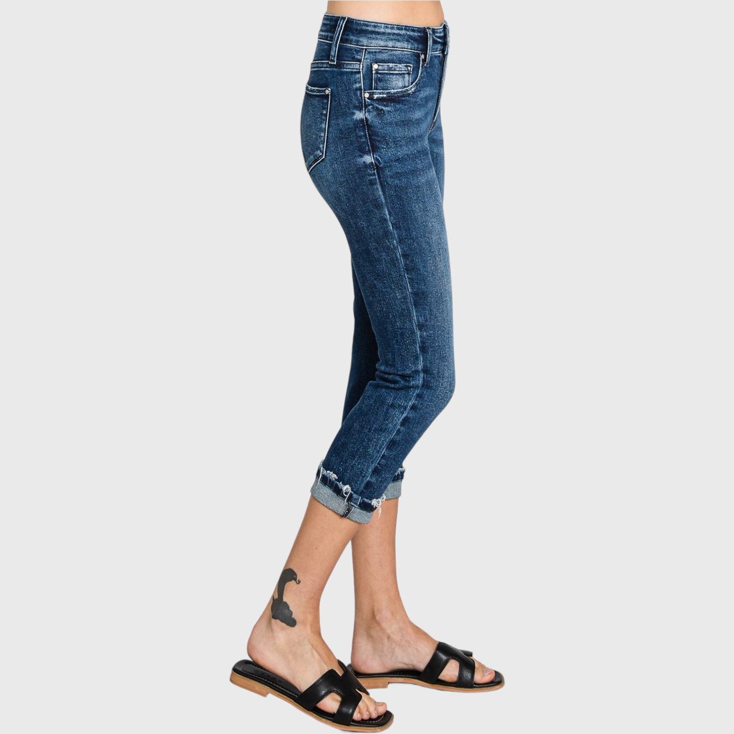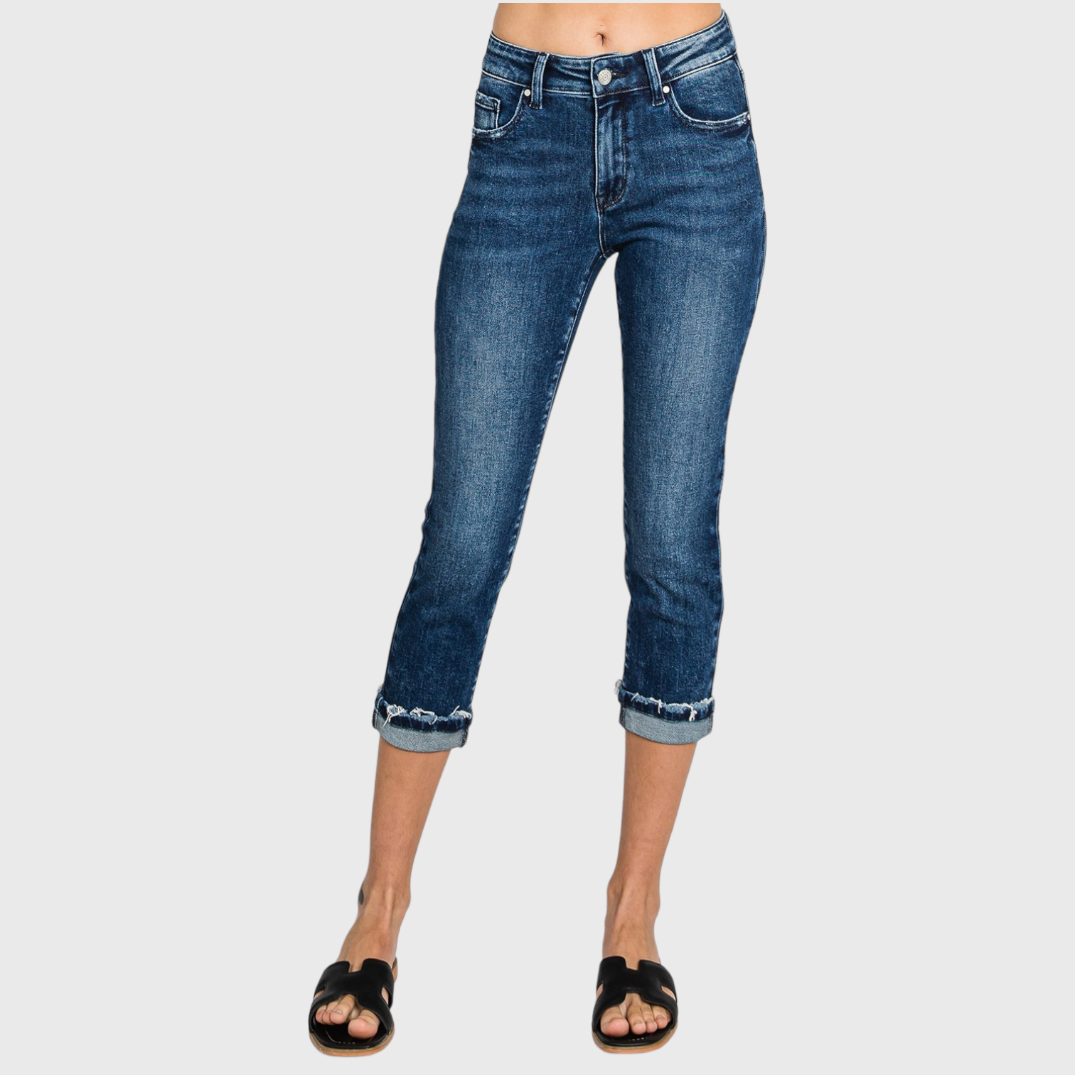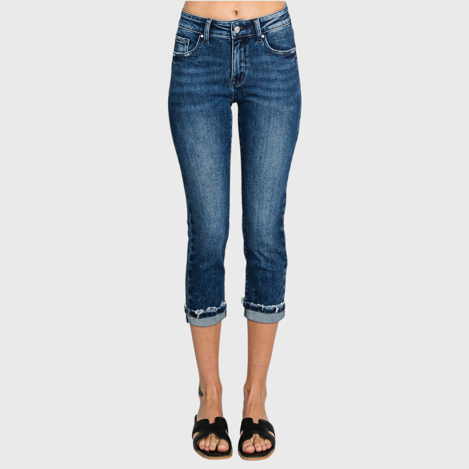 MID RISE SKINNY CAPRI JEANS W/ CUFFED HEM - 9" Rise, 21.5" Inseam after cuffed hem, Modeled in size 3/25 - Mid-rise Skinny capri silhouette - 1.5" single cuffed hem - Button closure and zip fly - 5-pocket styling - 88% Cotton,10% Rayon,2% Spandex