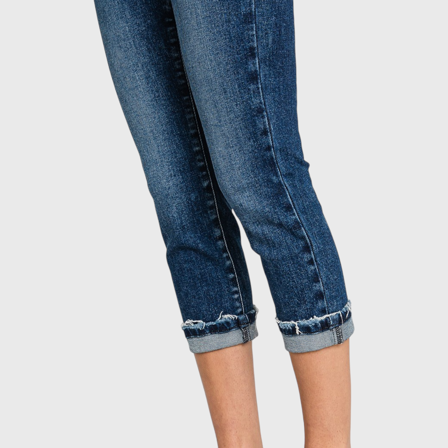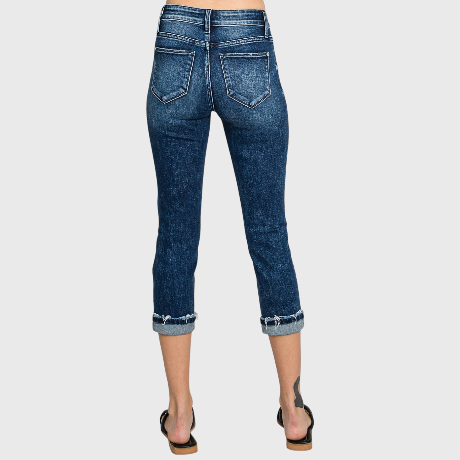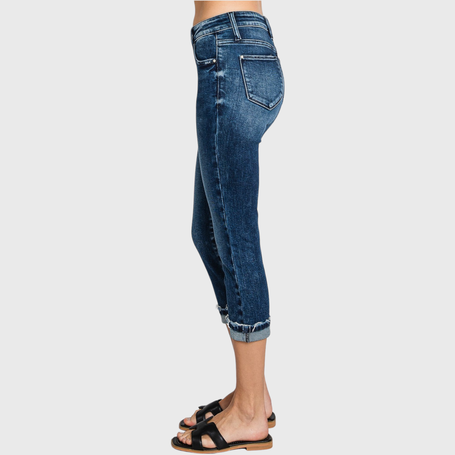 MID RISE SKINNY CAPRI JEANS W/ CUFFED HEM - 9" Rise, 21.5" Inseam after cuffed hem, Modeled in size 3/25 - Mid-rise Skinny capri silhouette - 1.5" single cuffed hem - Button closure and zip fly - 5-pocket styling - 88% Cotton,10% Rayon,2% Spandex