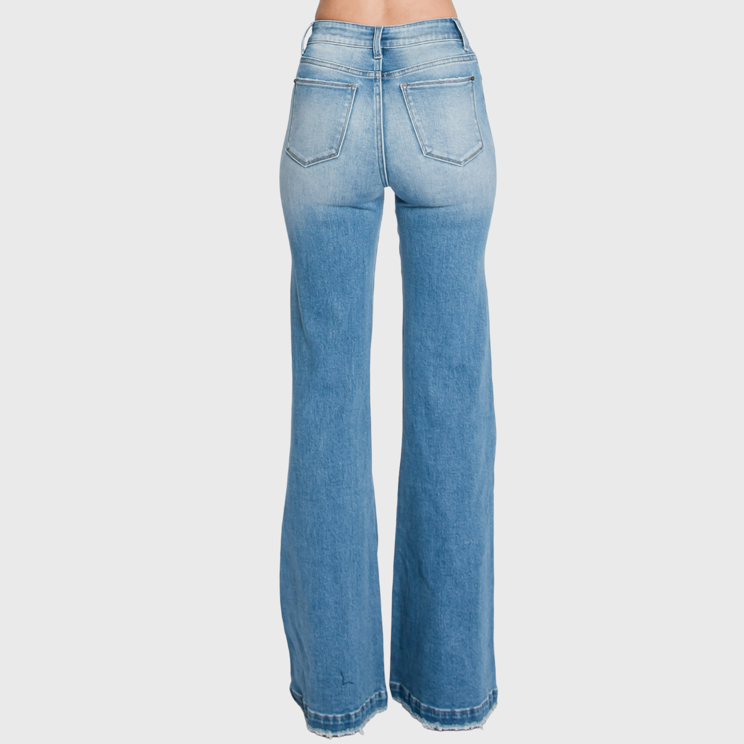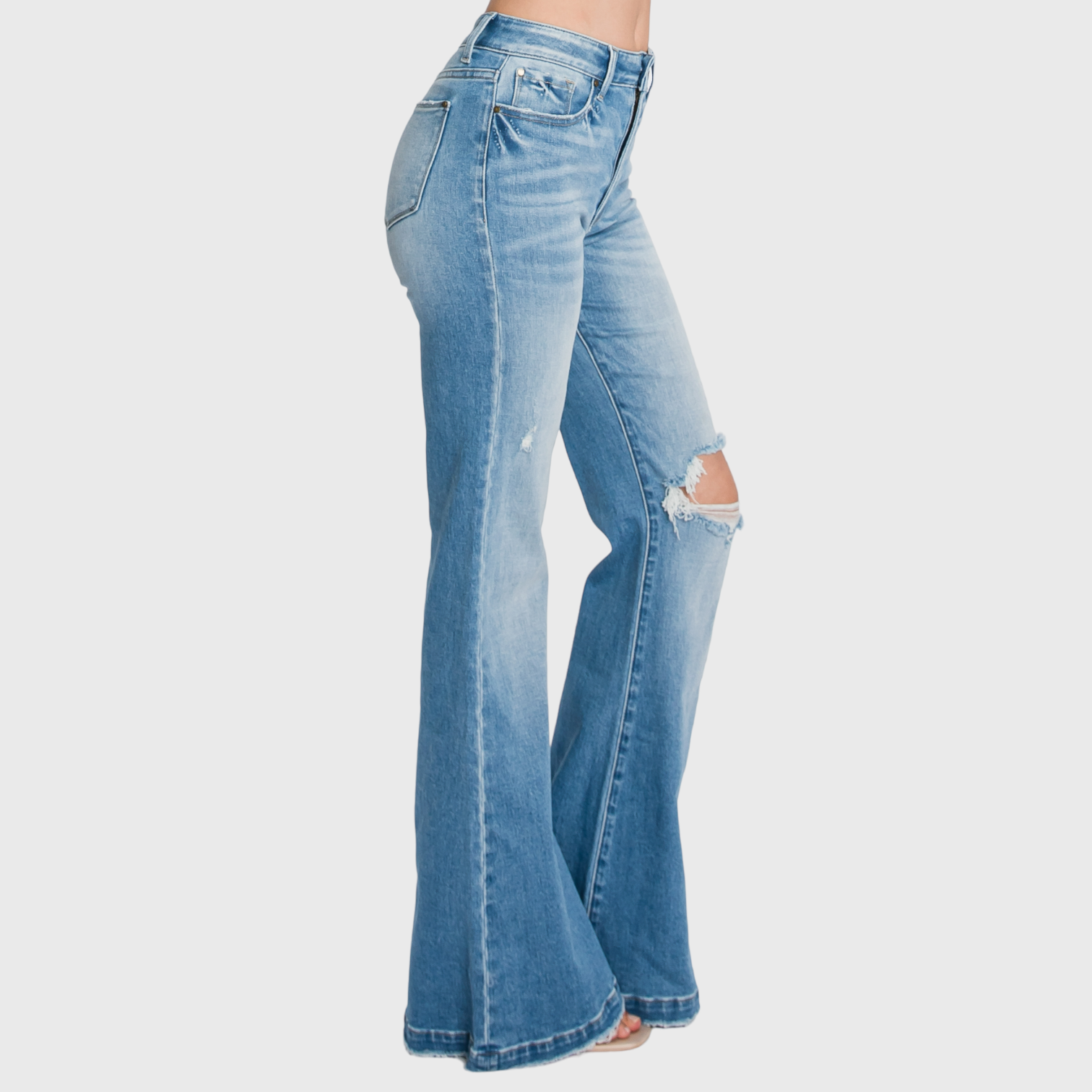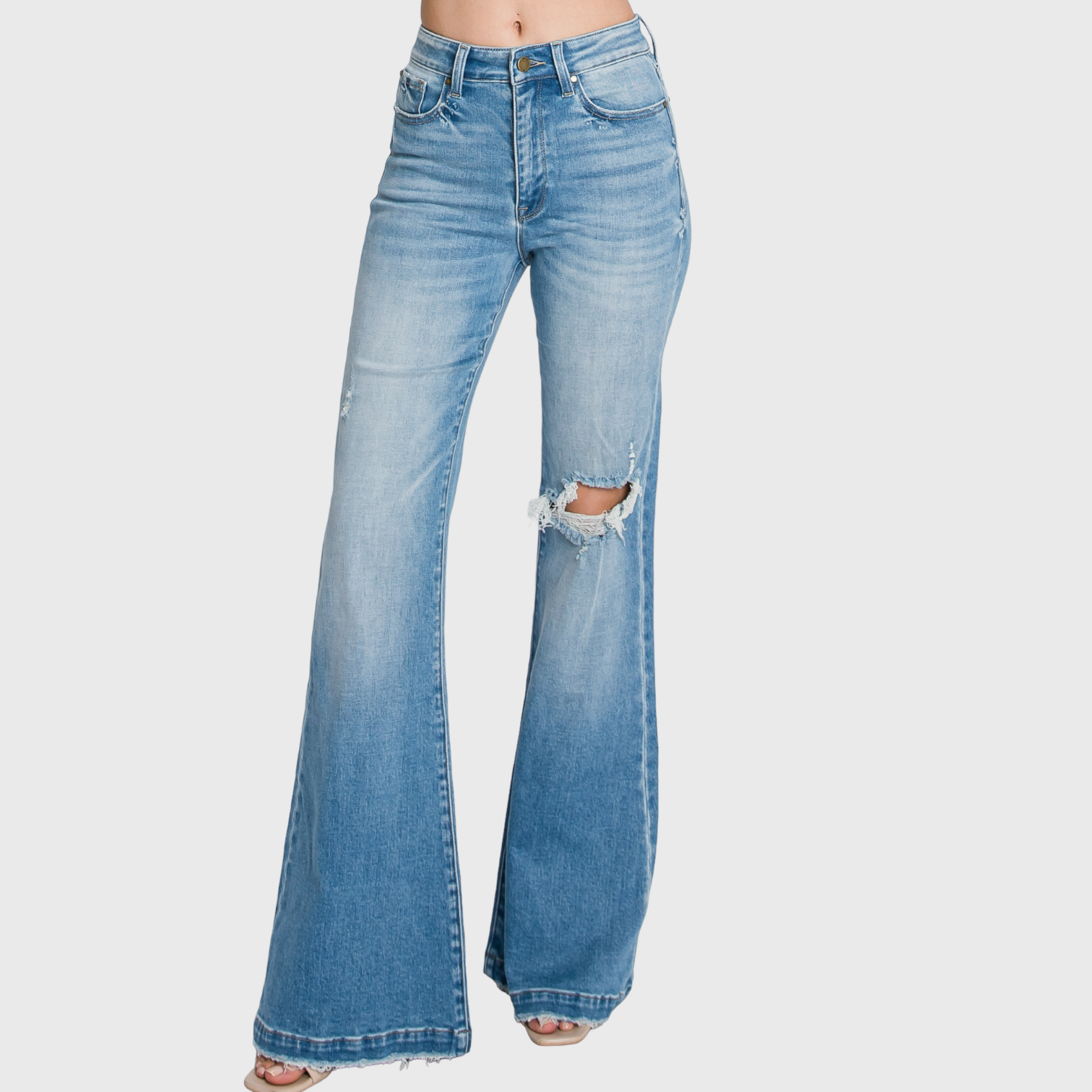 PETITE DISTRESSED SUPER HIGH RISE 70'S INSPIRED FLARE - 10.75" Rise, 31" Inseam - Modeled in size 3/25 - Super high-rise, '70s-inspired flare - Leg opening : 26" - Knee distressed - Button closure and zip fly - 5-pocket styling - 88% COTTON,10% RAYON,2% SPAN