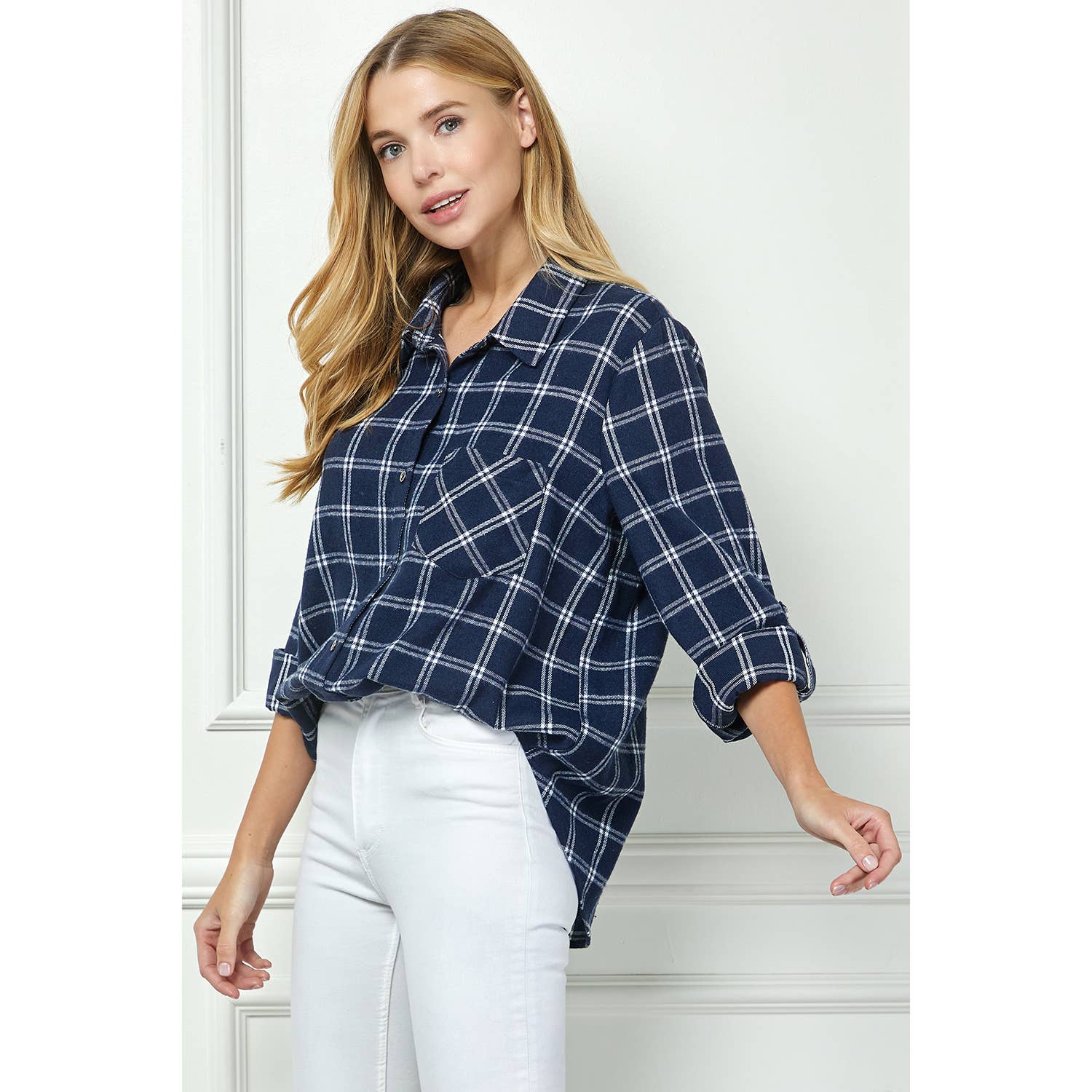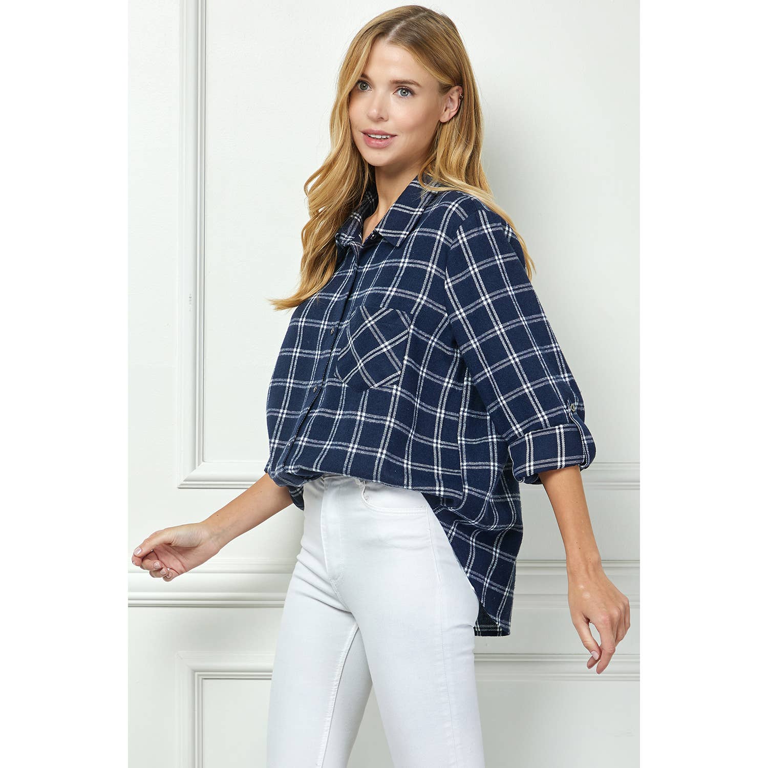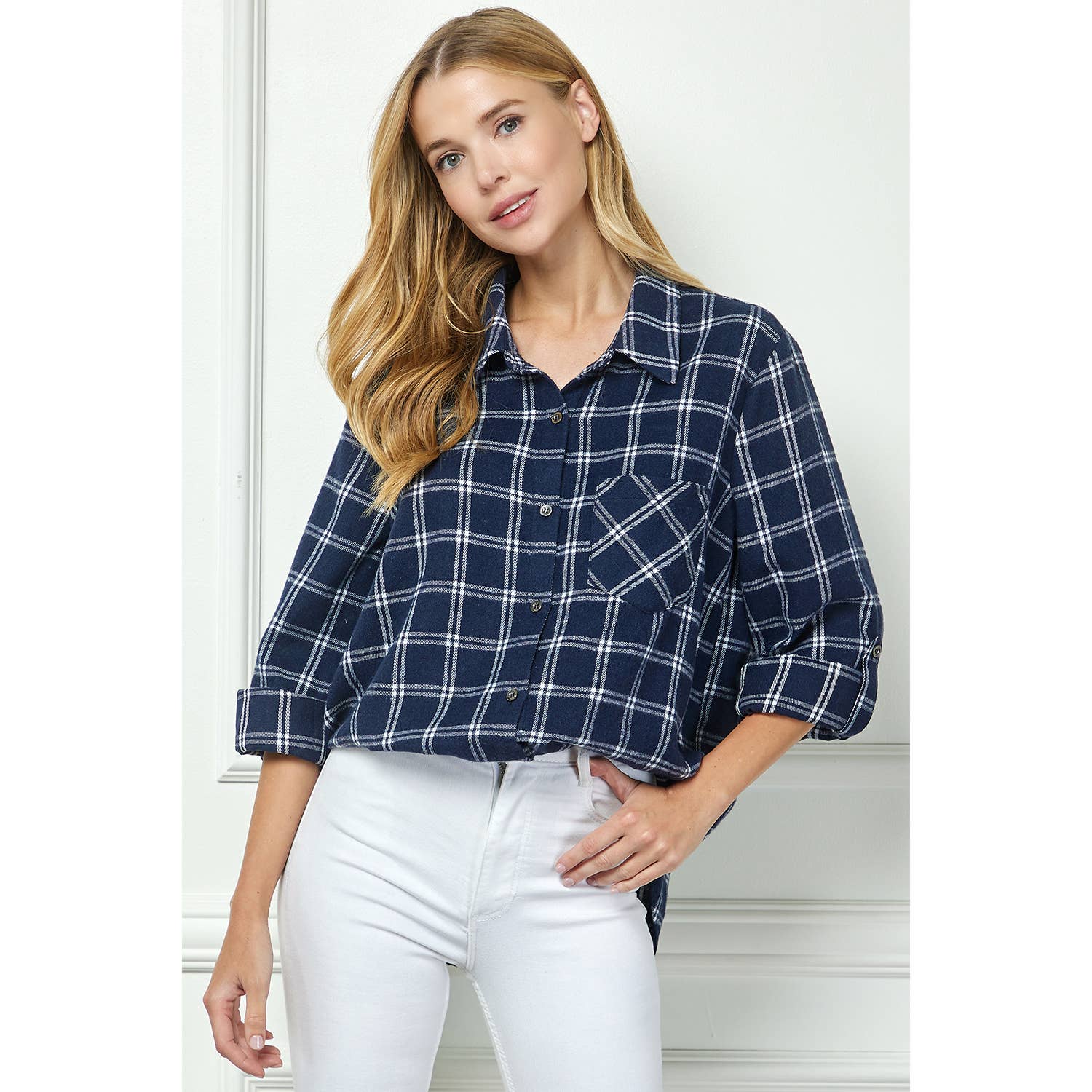 Embrace effortless style with our oversized flannel shirt, perfect for a relaxed and casual look. The roll up sleeves offer versatility, allowing you to adjust them for comfort and style. Featuring a classic collar neck and a convenient button-front closure, this shirt is both practical and fashionable. The single chest pocket adds a functional touch, while the oversized fit ensures maximum comfort. Made from soft, high quality flannel, this shirt is ideal for layering with a jacket or wearing open for a laid-back vibe. Suitable for all seasons, it's perfect for keeping cozy in cooler weather or adding a stylish layer in warmer months. MODEL WEARING SIZE MEDIUM
