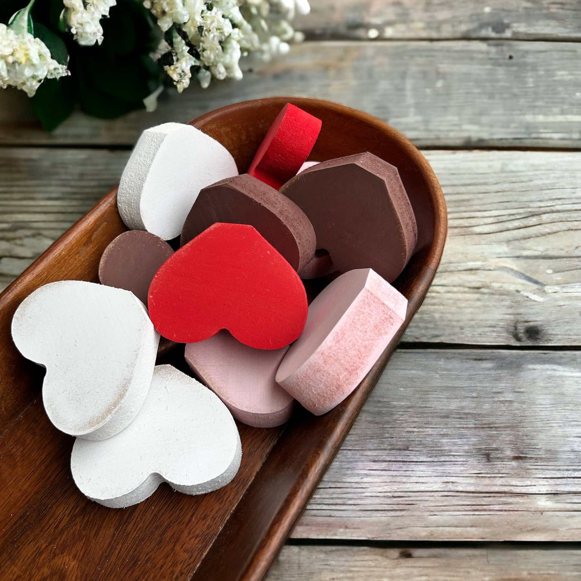 These sweet mini hearts are a great addition to your Valentine’s/winter décor. Use in vases, bowls, tiered trays, or as stand alone pieces. Made from 3/4” lightweight MDF. Each one is hand painted and sanded so no two hearts will look exactly the same. *Sold in sets of 3 Each heart measures approximately 2” x 2.5”
