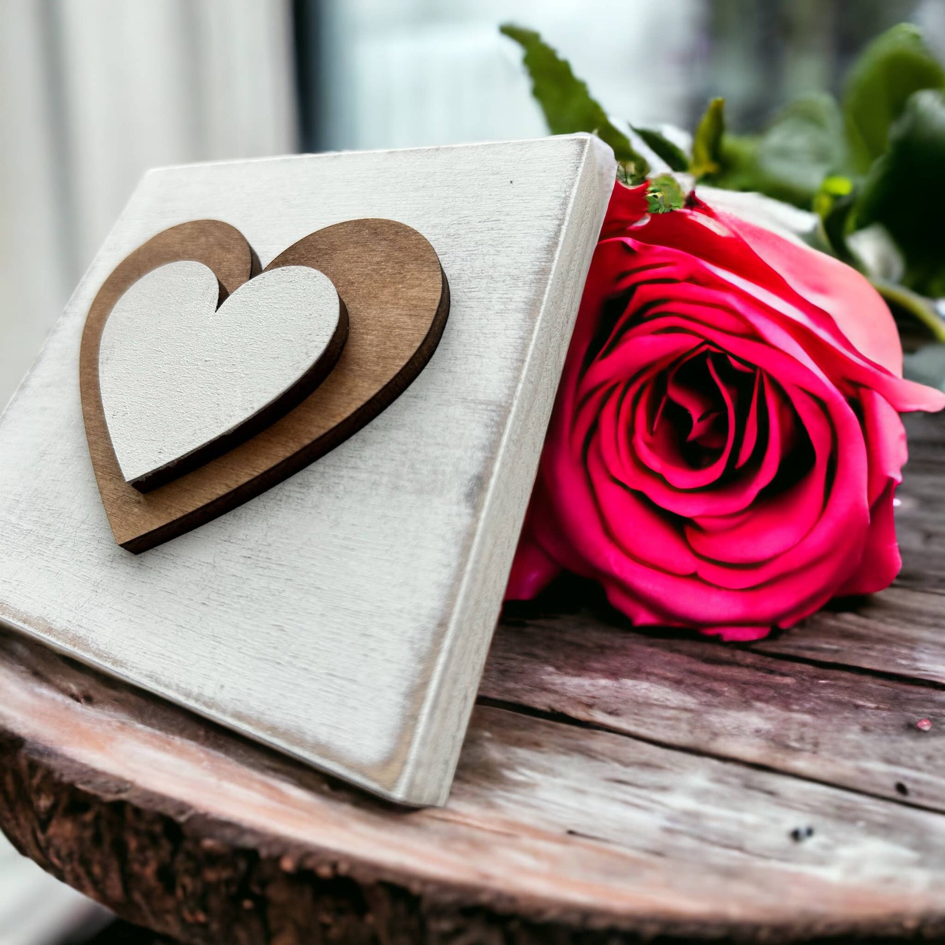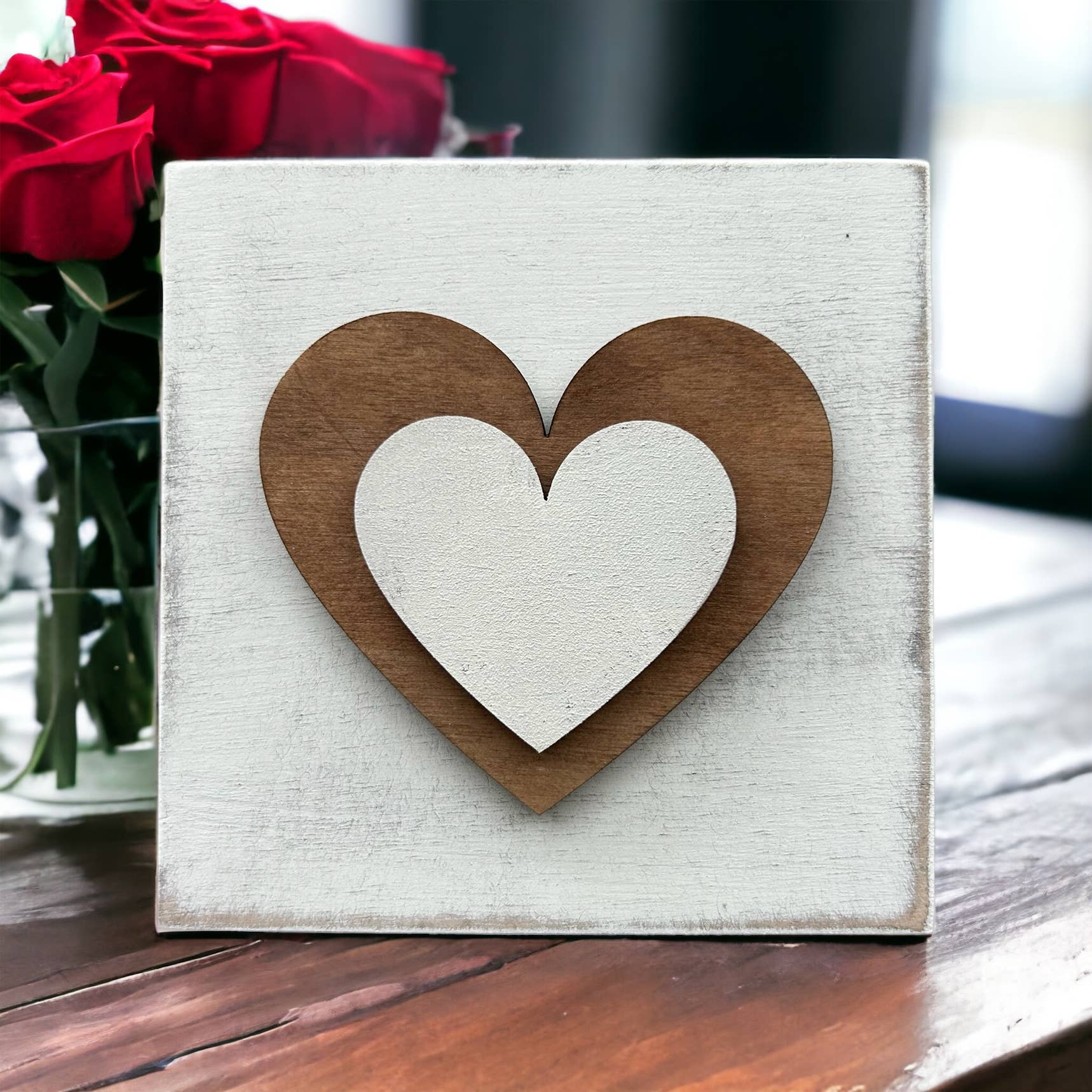 Add to your shop's Valentine’s Day décor with a unique wood sign. Hearts are cut out of 1/4” wood, stained, painted then sanded - then attached to a painted wood block sign.