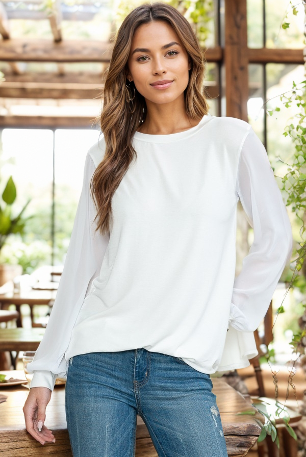 SOLID TUNIC TOP WITH CHIFFON SLEEVES 95%RAYON 5%SPANDEX MADE IN USA