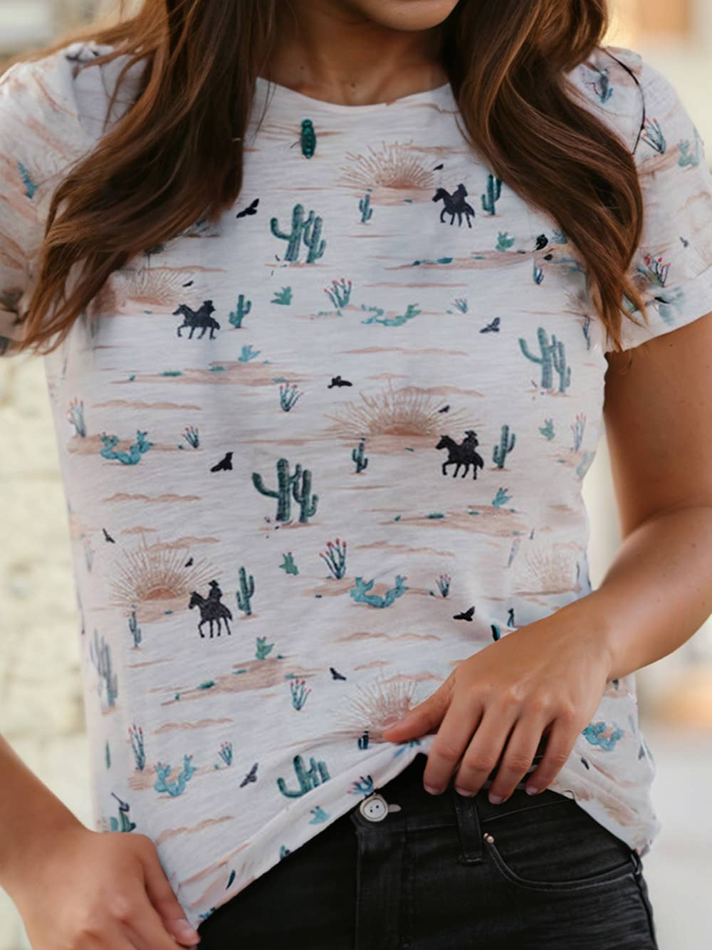 MUST HAVE TOPS: Western Cactus Print Crew Neck Short Sleeve Top