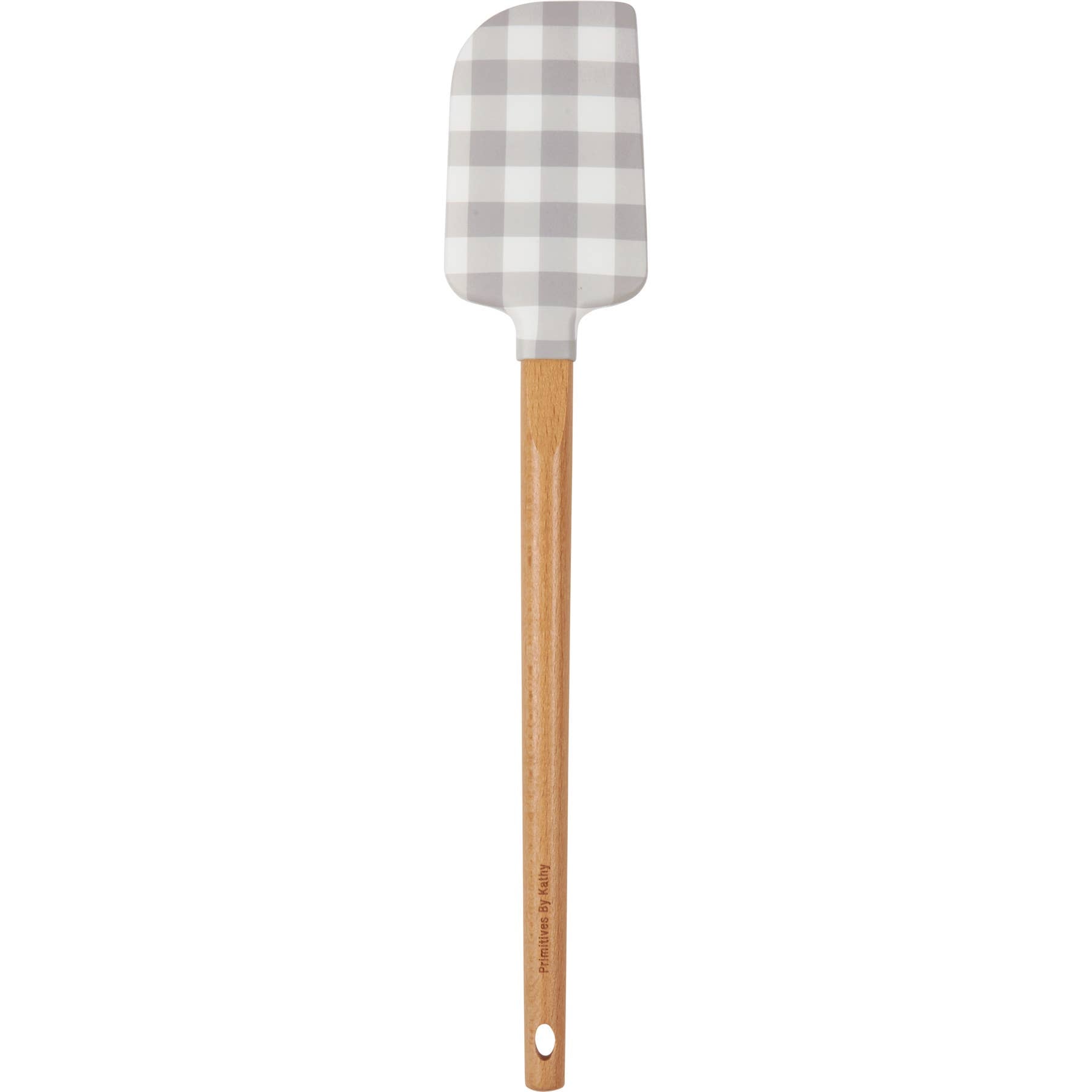 A double-sided silicone spatula from our Farmhouse Collection displaying a gray pig silhouette with "You Had Me At Bacon" sentiment on one side and gray gingham pattern on the other. Logo is engraved into wooden handle for added interest. Our You Had Me At Bacon spatula includes a complementing decorative bow and hole at the bottom for hanging. Hand-wash recommended; not microwave safe. A fun everyday kitchen accessory.